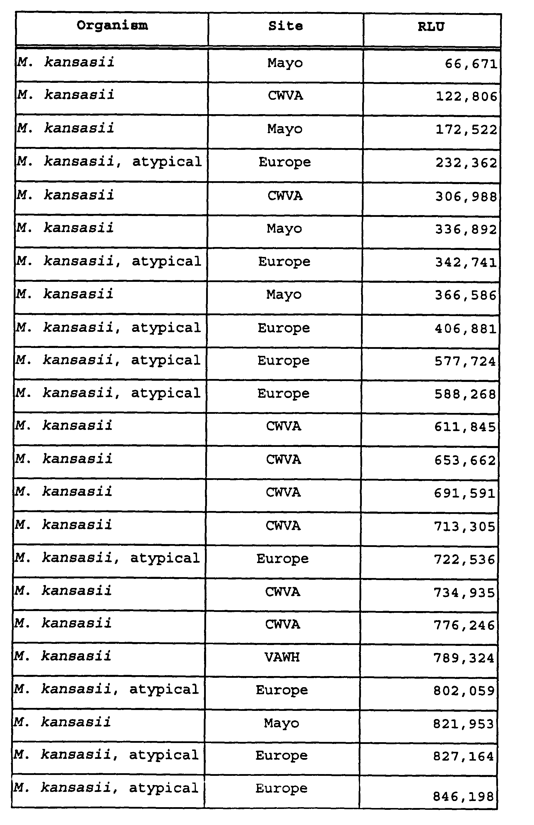 - M. kansasii are atypical. See for example Ross et al., J. Clin. Microbiol. 30 :2930-2933 (1992). These atypical subspecies have variations in their 23S rRNA sequence, and therefore are not necessarily detectable with probes directed to 23S rRNA derived from the typical strains of M. kansasii. However, these atypical strains have been implicated as causative agents in infections, and it is therefore causative agents in infections, and it is therefore important to be able to identify the atypical strains as M. kansasii. Therefore, the term M. kansasii as used herein refers to both typical and atypical strains of the organism.