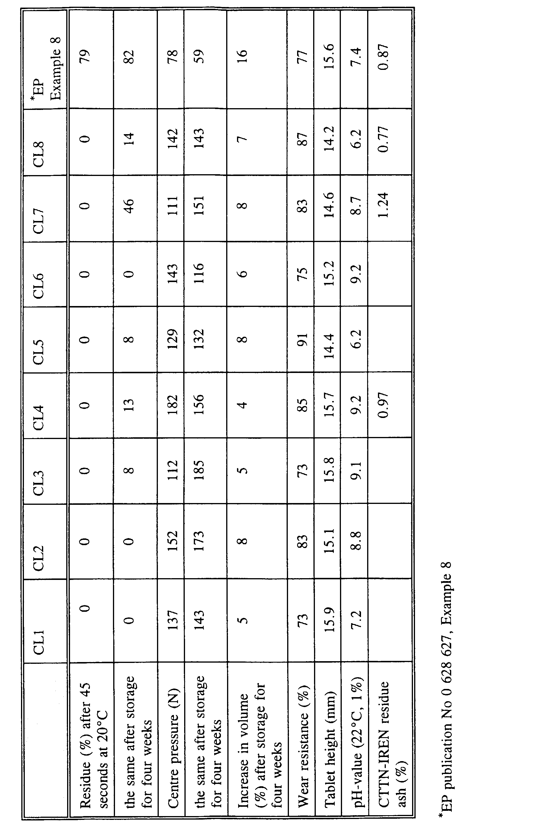 - the weight of the tablets after treatment is stated in percentage of the initial weight of the tablets. A high value thus indicates a high wear resistance.