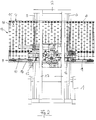 - a Support device 13 is provided, consisting of a field of free-running Support rollers 14 which are rotatable about axes 15 which are in the frame 8 of extend from bottom to top. Instead of such a field of support rollers 14 an air cushion wall could also be provided.