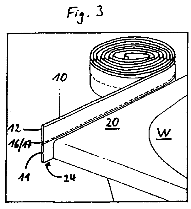 - the profile strip 11 is also included an adhesive coating 23, which the Attachment of the profile strip in the shown in Fig. 3 Way on a vertical tub rim 24th a tub W serves.
