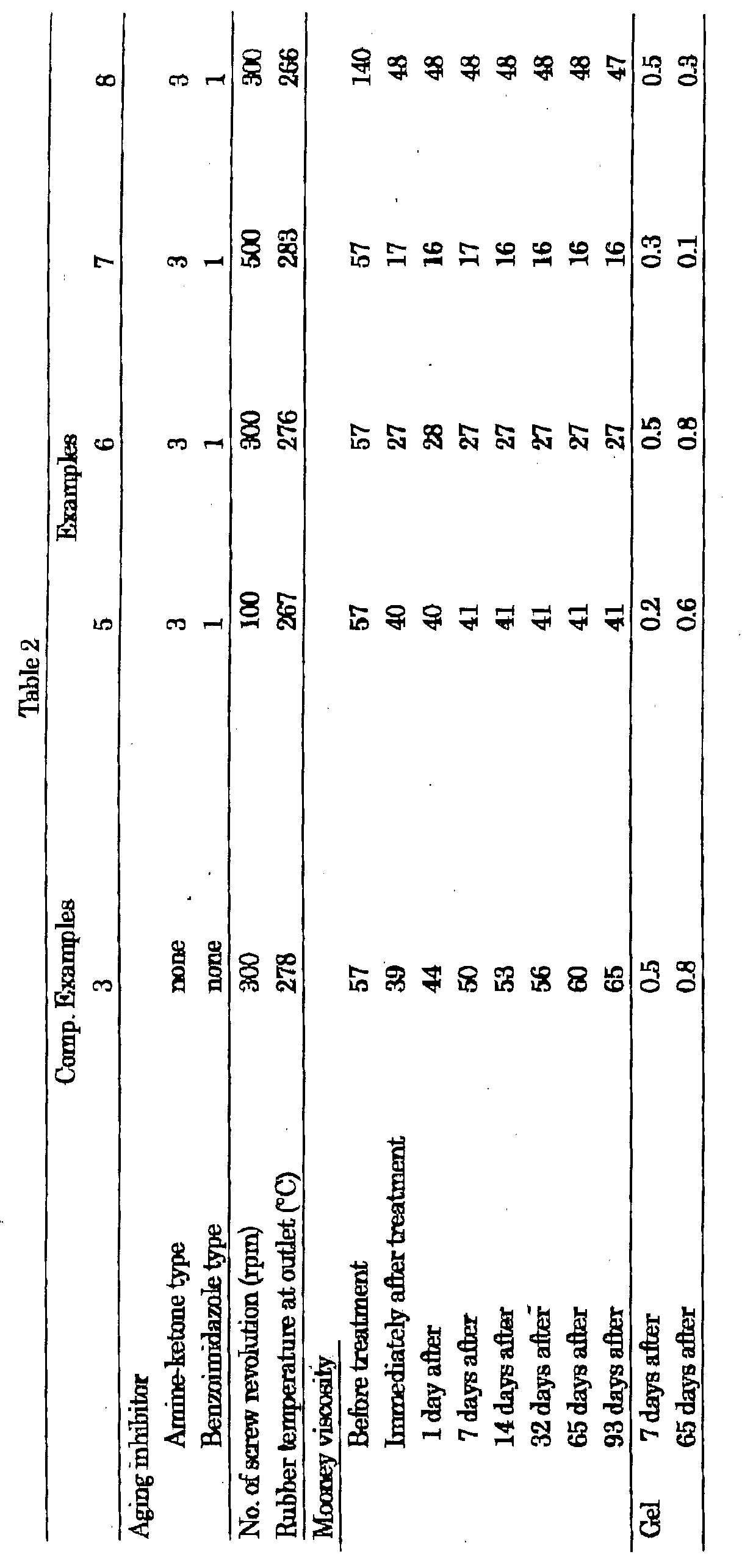 In the proposed process, free radicals generated upon the thermal-oxidative degradation are stabilized by an oxygen donor. It has been found that the rubber gels due to peroxides, a carboxyl group and carbonyl group, remaining after the high-shearing-force applying treatment. Even if a conventional aging inhibitor is added to the rubber after the high-shearing-force applying treatment, the Mooney viscosity increases during storage of the rubber.
