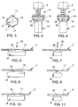 die Figuren 6 bis 11 verschiedene relative Lagen von Rasten an der Pufferanordnung und Fortsätzen im Lochbild des Bleches und