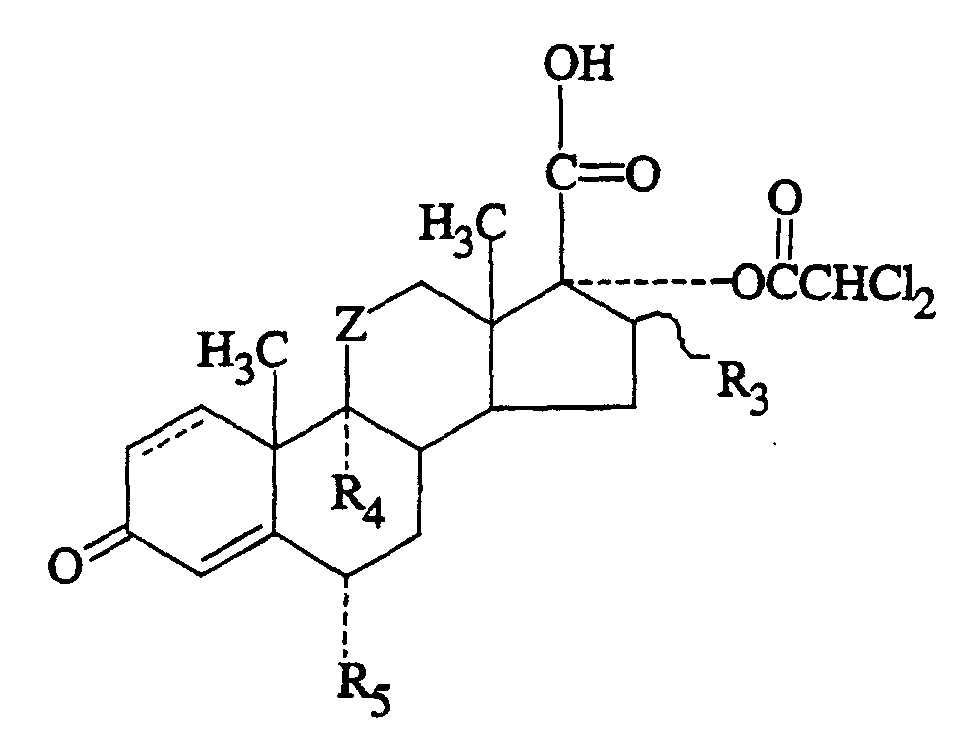 • Another preferred group of compounds consists of the compounds of formula (I) wherein Z, X and R 1 are defined as with formula (I) hereinabove and the remainder of the structural variations are identical to those in the corresponding positions of hydrocortisone (i.e. , R 3 , R 4 and R 5 are each a hydrogen atom and the 1,2-linkage is saturated) or of prednisolone ( i.e ., R 3 , R 4 and R 5 are each a hydrogen atom and the 1,2-linkage is unsaturated), especially when R 1 is unsubstituted C 1 -C 4 alkyl or chloromethyl, most especially when R 1 is unsubstituted C 1 -C 4 alkyl.