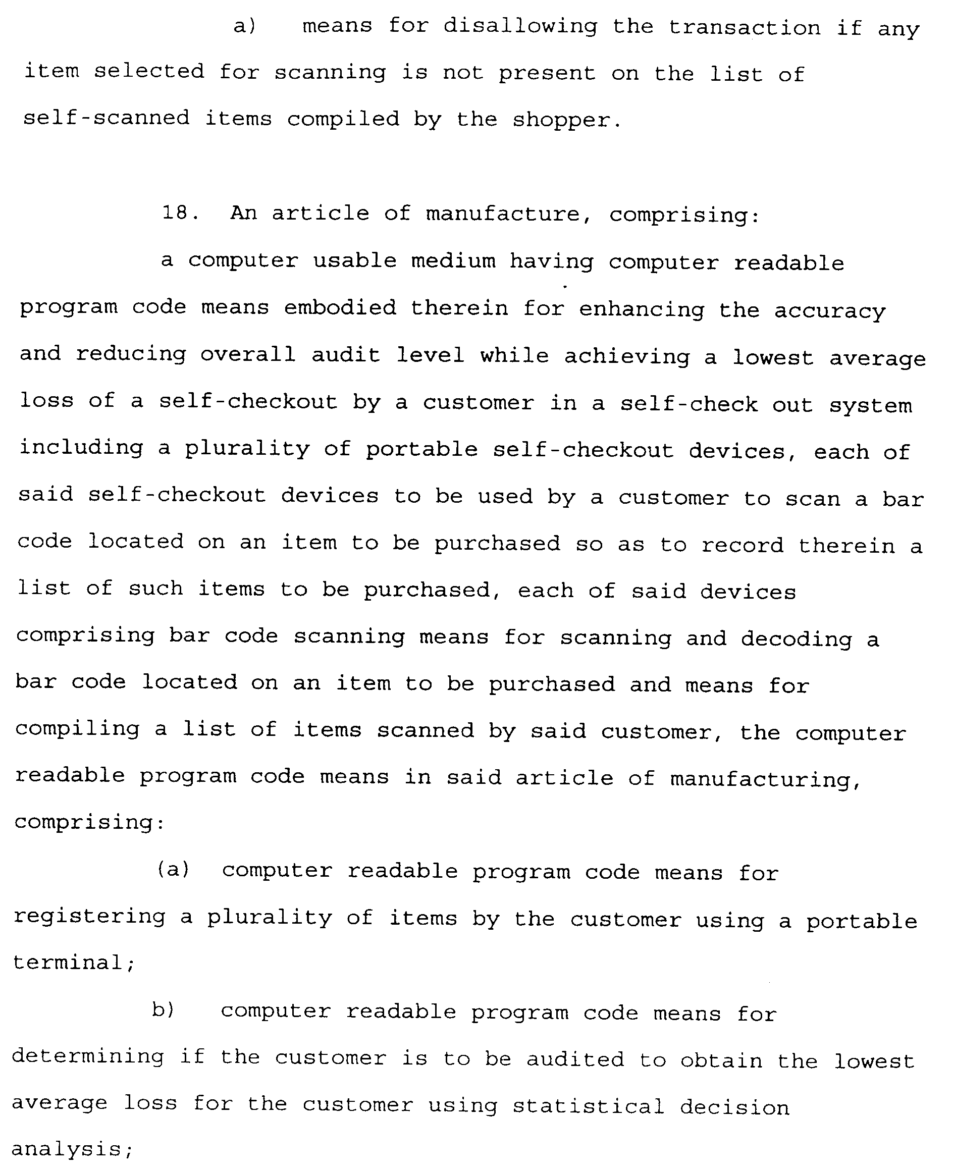 • Each of the point-of-sale terminals in the present system comprised bar code reading means for reading said two-dimensional bar code from a tally list presented to a cashier operating said point-of-sale terminal, said bar code reading means providing as output data signals representing said items scanned by amid shopper, said unique identification record associated with said shopper, and said number of items scanned by said shopper; said bar code reading means also configured so as to scan select items presented for checking by maid cashier; means for determining, as a function of said number of items scanned by said customer and an internally stored check number unique to said customer, the number of items n to be scanned by the cashier; means for comparing the identity of the items scanned by said cashier with the list of items scanned by said customer; means for allowing the shopping transaction if each item selected for scanning by the cashier is present on the list of self-scanned items compiled by the shopper; and means for disallowing the shopping transaction if any item selected for scanning by the cashier is not present on the list of
