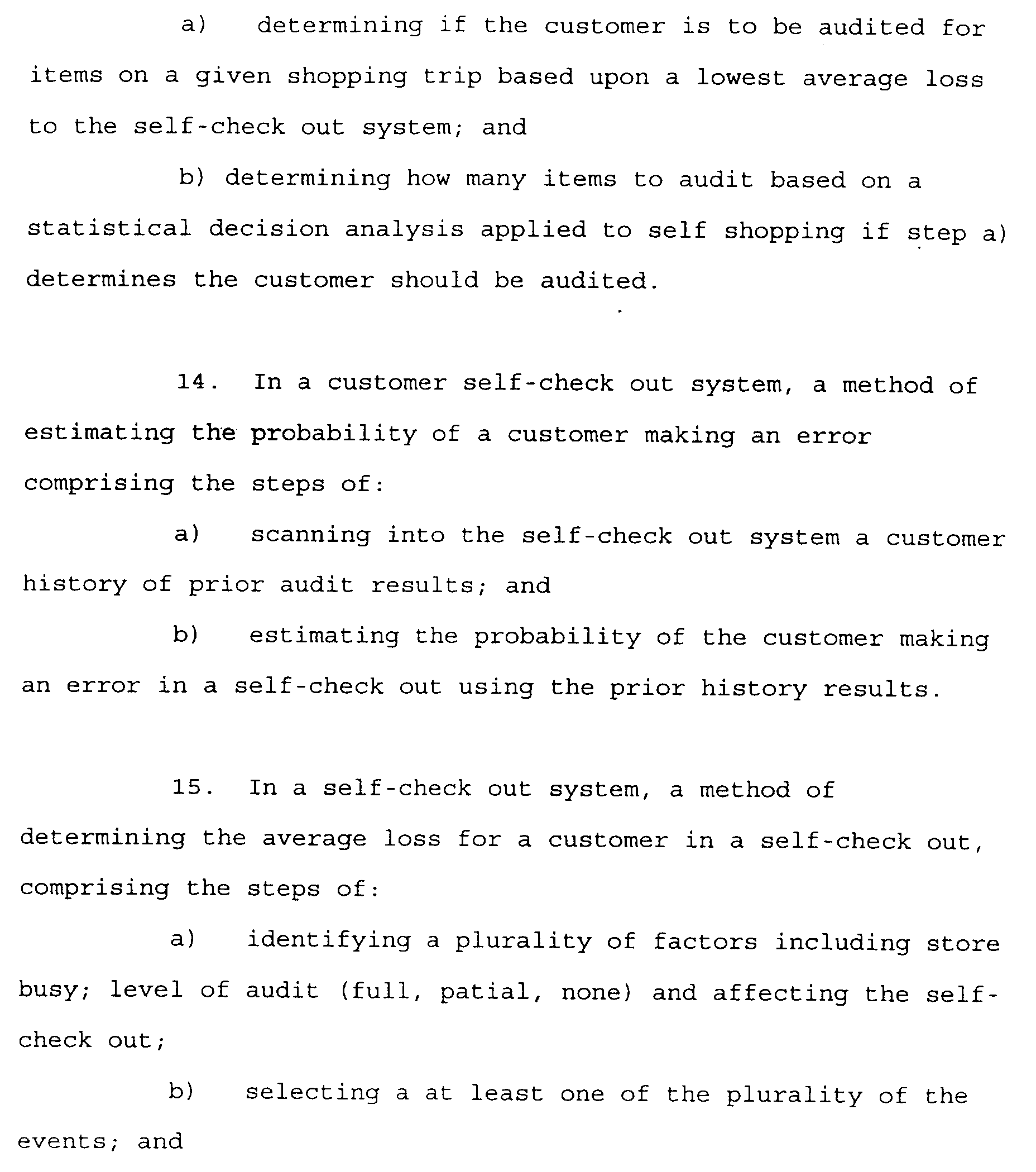 • a shopping transaction is allowed according to a statistical decision if the minimum check-out loss for the transaction is less than a threshold defined by a loss function L(c) and (p), where L(c) is the expected inventory loss associated with the shopper and (p) is the probability of performing an audit on the shopper.