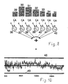 - FIG. 3 shows in horizontal and vertical representation shifted four spectrogram curves 7, 8, 9, 10 for each yarn consisting of fibers of constant length, the length of the fibers for these yarns from the spectrogram 7 to the spectrogram curve 10 increases. Lengths of fibers for these yarns can be seen in Fig. 2 on the axis 4, for example, at points 6, 11, 12, and 13. Along axes 14 are values for wavelengths and along an axis 15 values for amplitudes or the power density (as detected by regularity checker) are plotted.