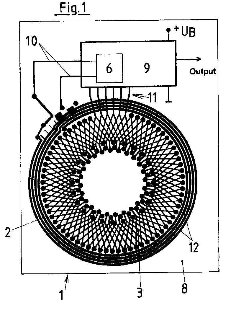 - the rotor element belonging to the angle sensor is not shown in FIG. This is located at a short distance from the stator element without contact (1) and is rotatable relative to it with respect to a common axis of symmetry arranged.