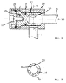- This sliding hub 13 in turn has a inside of the gas supply pipe 1, i.e. into the inside of the angled pipe part 5 protruding free front end 15, an adjoining, sealed against the inner wall 14 of the tubular bushing 4, coaxial sealing section 17, one with several radial circumferential grooves 18, each of the locking positions I-III are assigned, provided locking section 8 and one attached to it and to the sliding head 16 Guide section 9.