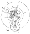 - the brake lever 9 engages with the guide webs 50, the guide lugs 51 and the guide pins 52 in slots 29 and other guides of the base plate 1. As a result, the brake lever 9 is radial Direction.