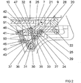 - a drag lever 40 is rotatably mounted about the housing-fixed pivot axis 31 and the Catch 20 upstream. It consists of one or two arms 41 and a bridge 42, to which the first leg 44 of a second spring 43 (here also a hairpin spring) acts. Its second leg 45 is located on a part of the housing 1, a housing wall 46 on. The rear upper end of the bridge 42 forms a crest edge 47, which in still too descriptive manner with the nose 32 cooperates.