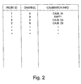 - calibration memory 46 An example of a suitable organization for calibration memory 46 is shown in FIG. 2. Calibration information is classified and addressed according to probe ID and channel. Thus, for example, when probe 2 is connected to channel B, calibration information 2B is accessed in calibration memory 46 and is supplied to parameter processor 40 for calibration of measurements by probe 2 on channel B. If probe 2 is connected to channel A, calibration information 2A is accessed in calibration memory 46. It may be observed that calibration memory 46 does not include calibration information for probe 1 connected to channel B, because probe 1 has not been calibrated on channel B.