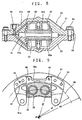 - a typical conventional opposed-piston type disk brake has a caliper 50 comprising separate inner and outer portions 51 and 52 as shown in Figs. 8 and 9.