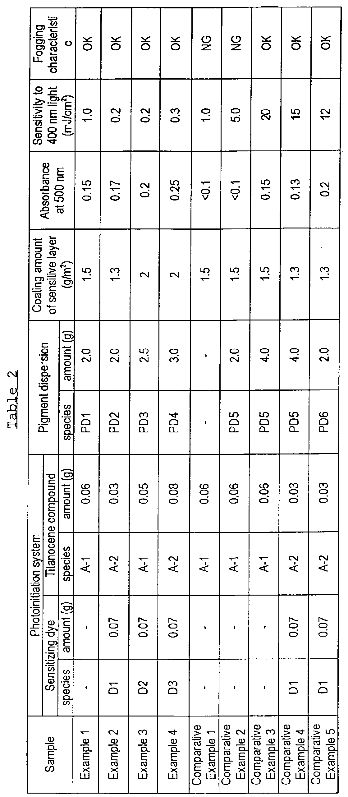 • a main object of the invention is to construct a CTP system that can achieve excellent productivity, operation suitability and economical efficiency. More specifically, what the invention is mainly aiming at is providing a photosensitive composition having high sensitivity at the oscillation wavelengths of inexpensive short-wavelength semiconductor laser devices and capable of being handled also under bright safelight, and a method for image formation using the composition.
