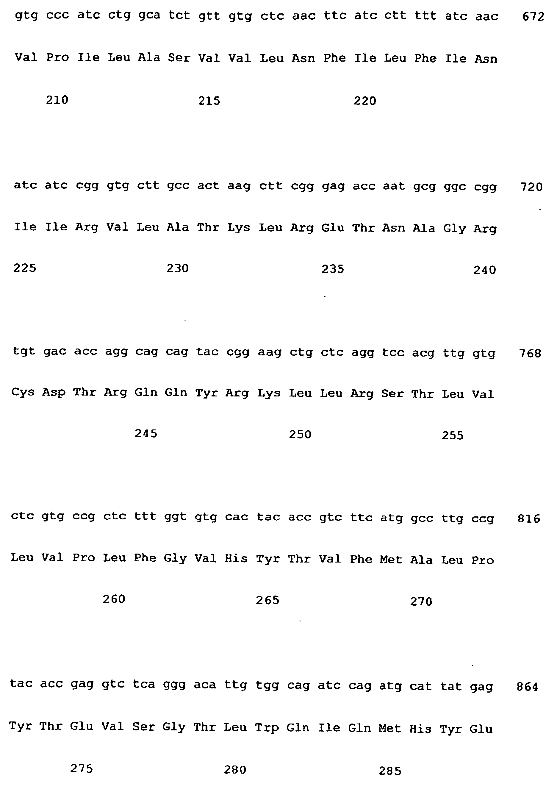 - Isolated nucleic acid molecules of the present invention include DNA molecules comprising an open reading frame (ORF) shown in Figure I (SEQ ID NO:1); DNA molecules comprising the coding sequence for the r ⁇ Nt receptor shown in Figure 1 (SEQ ID NO:2); and DNA molecules which comprise a sequence substantially different from those described above but which, due to the degeneracy of the genetic code, still encode the r ⁇ Nt receptor.