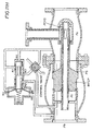 - the baffle When pressure build-up at the baffle, as sensed directly or indirectly, is deemed to reach or exceed a targeted pressure, the baffle is structured to cease squeezing down and, if necessary, to shift to enlarge the effective size of the annular discharge port. Such enlargement would continue, in general, until the discharge pressure reduces to the preset target or a limit is reached. Such adjustments in the size of the discharge port cause the flow rate to vary, but the fluid that is discharged tends to be discharged with a more constant "authority" and range, an authority and range associated with the targeted pressure.