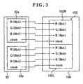 - the video card 30 transfers, from the first link 32a, the clock signal and the R, G and B image data, each having 8 bits corresponded to the right screen 102R of the LCD 100, and also, transfers from the second link 32b the clock signal and the R, G and B image data. Each having 8 bits corresponds to the left screen 102L.
