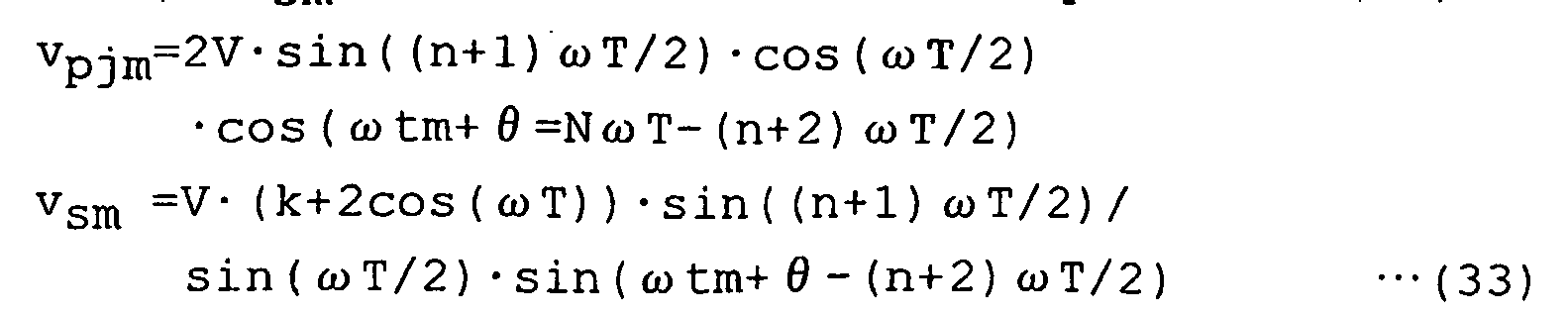 - v sm V ⁇ k + 2 ⁇ cos ⁇ ⁇ T ⁇ ( sin n + 1 ⁇ ⁇ ⁇ T / 2 / sin ⁇ ⁇ T / 2 ⁇ sin ⁇ ⁇ t m + ⁇ - n + 2 ⁇ ⁇ ⁇ T / 2