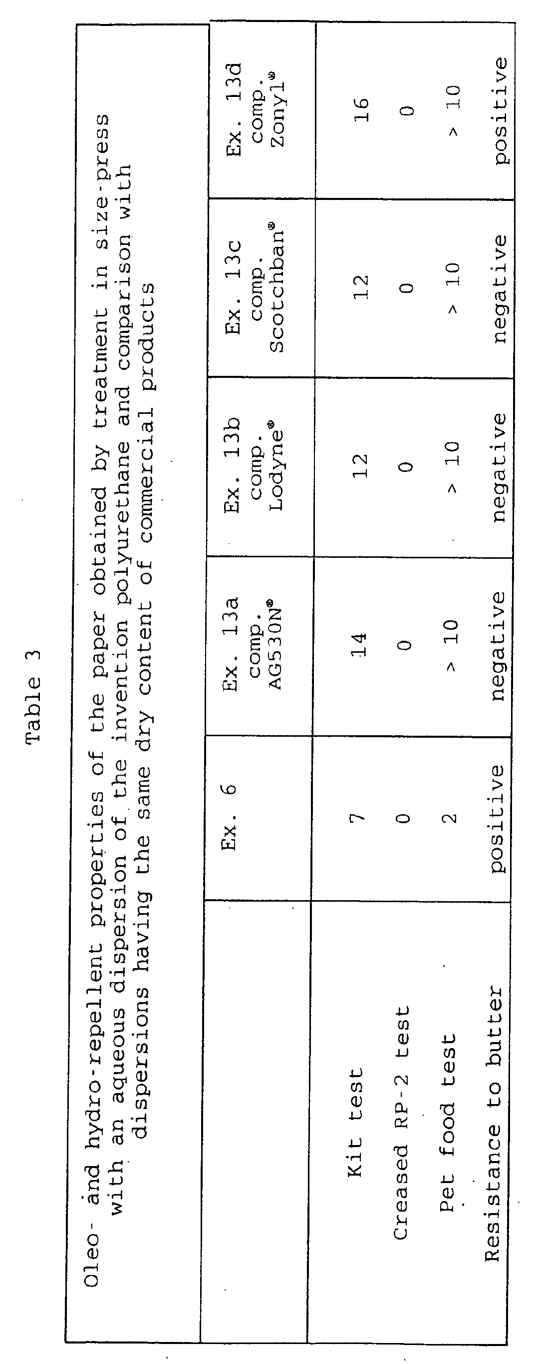 • the oleo-repellence values obtained by the Kit Test are however an index of the only surface activity of the fluorinated additive, and often they have a poor correlation with the real performance in terms of protective barrier to oils and fats, both in normal utilization conditions of the paper packagings, for example in prolonged contact times with foods, and in severe pressure working conditions (calendering for the obtainment of paper manufactured articles), temperature (heating of the paper manufactured articles in microwave ovens) and mechanical stresses (for example bending to obtain the manufactured article). For this reason the paper users utilize a series of more indicative performanace tests of the practical behaviour in terms of resistance to fats and oils.
