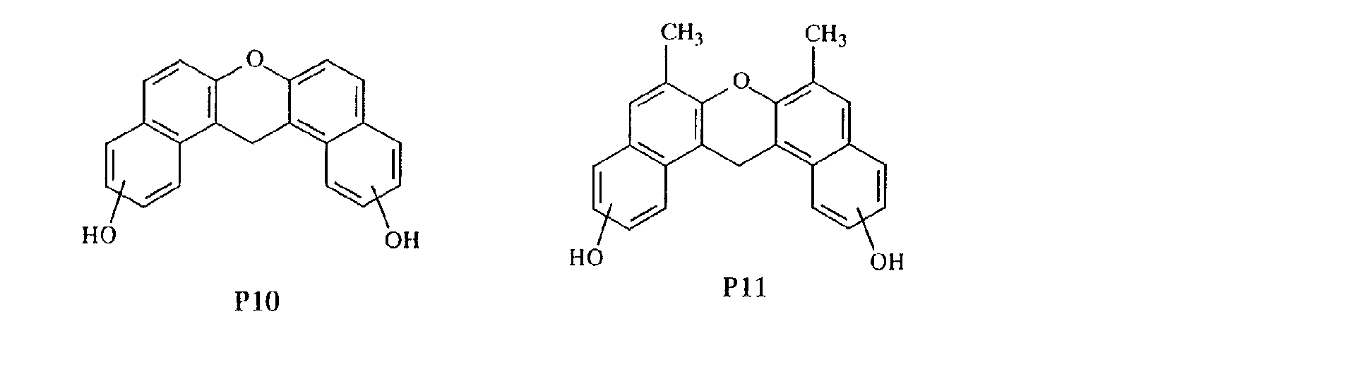 - the novel phenol compound represented by the general formula (3) or (4) can be prepared by reacting dihydroxybenzene having hydrogen atoms at the position adjacent to hydroxyl groups or dihydroxynaphthalene having hydrogen atoms at the position adjacent to hydroxyl groups with a carbonyl group-containing compound in the presence of an acid catalyst.