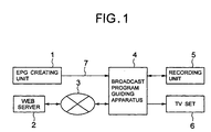 - the EPG creating unit 1 regularly creates EPG data for a predetermined period of time, such as one week, and has a receiving/transmitting function that sends the EPG data to the broadcast program guiding apparatus 4 in response to an EPG data request from a terminal that includes the broadcast program guiding apparatus 4, via a line 7 such as a telephone line, a cable television line, etc.