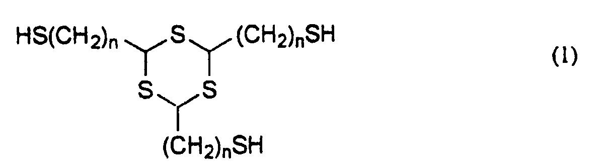 - novel thiol compound of the invention is represented by the general formula (1) mentioned below, from which it is seen that the compound has three identical mercaptoalkyl groups bonded to the trithiane ring thereof. wherein n is 1 or 2.