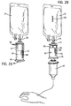 - the container 20 has a drug delivery tube 32 extending from the first end 24 of the container to provide a first flow path 21 for the beneficial agent from the container 20 to a reservoir 12, such as a standard part-fill IV bag or bottle.