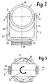 - Fig. 2 shows a frontal view of the annular receptacle 3, which is mounted by means of their bearing pin 5 on the legs 23 of the fork 7 about the axis 11 pivotally.