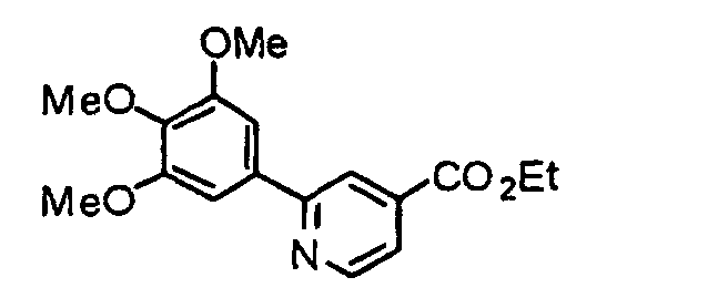- a chlorinated compound (2) is reacted with 3,4,5-trimethoxyphenylboronic acid (3) at 0°C to reflux temperature, preferably 90°C for 10 minutes to several days, preferably 5 hours in the presence of a metal catalyst such as tetrakis (triphenylphosphine) palladium (0) and a base such as 2 M sodium carbonate in a solvent such as toluene, benzene, tetrahydrofuran (THF), dioxane or acetonitrile, thereby obtaining a condensate (4).