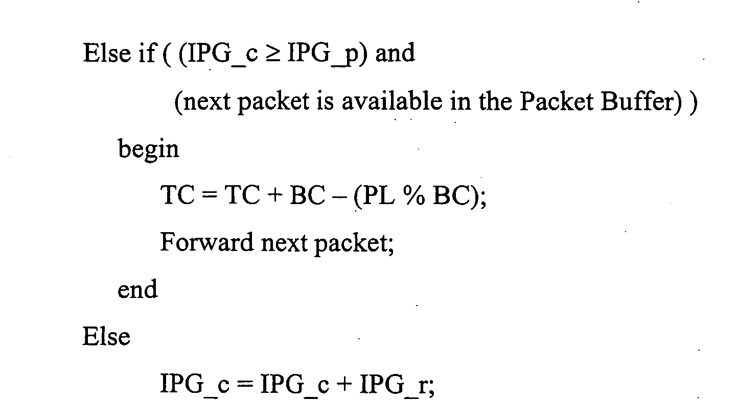 - step 307 it is determined whether the current IPG is greater than or equal to the predefined IPG. If the statement in step 307 is true, the process proceeds to step 308, where it is determined whether the next packet is available in the packet buffer. If the next packet is available, then the token count is increased by BC, less the remainder of the packet length divided by the BC value. Thereafter, in step 310, the packet is forwarded. However, if either of the evaluations in steps 307 and 308 is not true, the flow passes to step 311, where the current IPG count is increased by the remaining bytes in the current cycle. Thereafter, the process continues with step 301 and the remaining process steps are evaluated again.