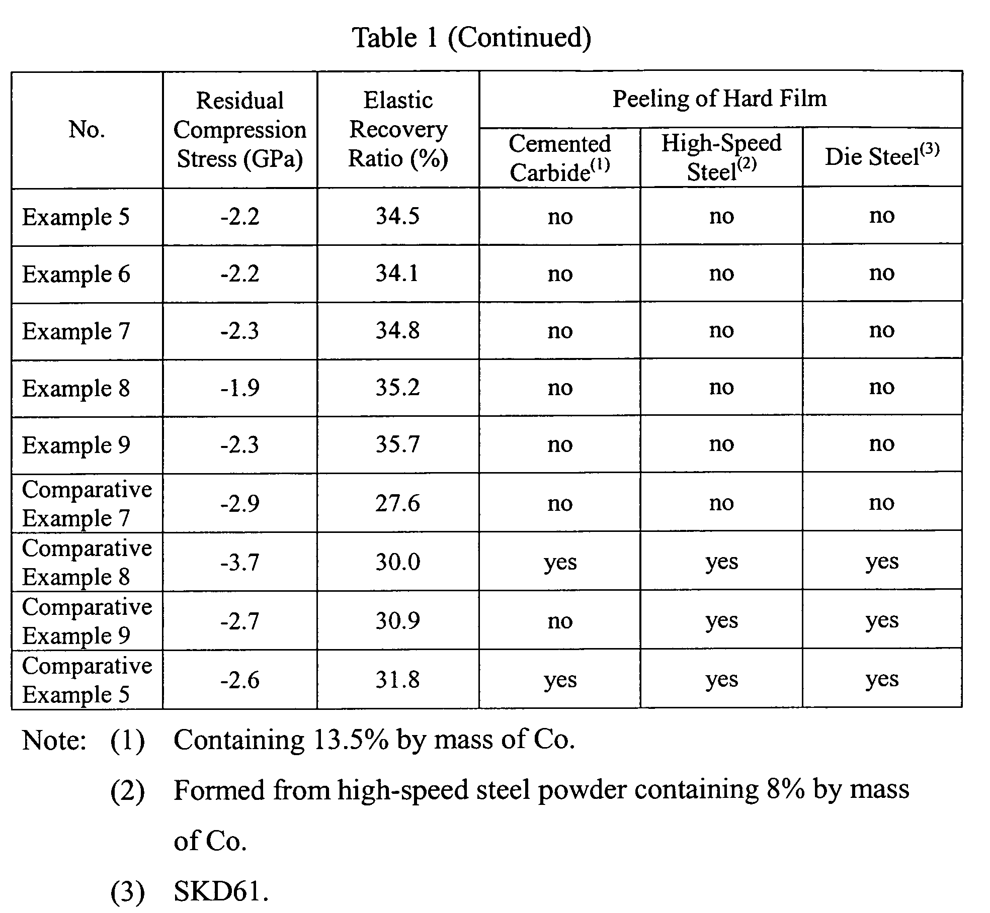 - x exceeds 0.75, the hard film has an excess residual compression stress, resulting in self-destruction immediately after coating and thus drastic decrease in strength.