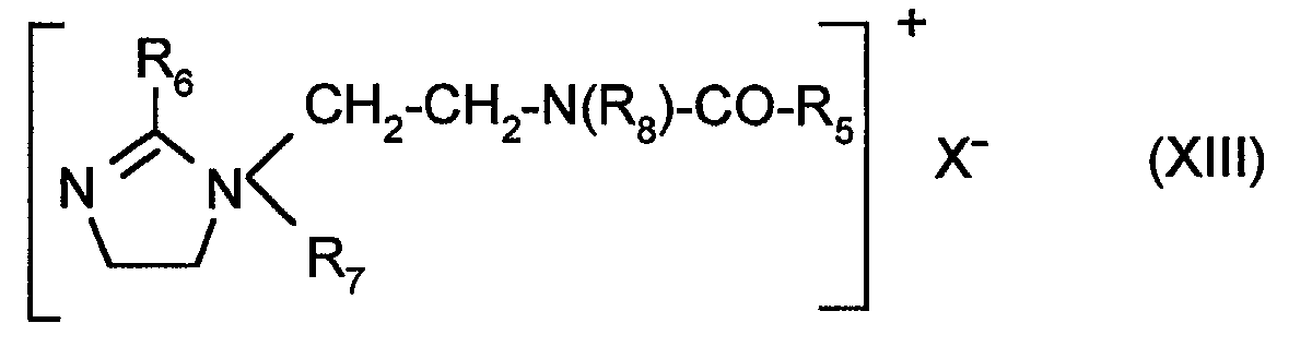 • C 1 -C 20 hydrocarbon group means an aliphatic chain C 1 -C 20 , preferably C 6 -C 18 which can be interrupted by one or more (from 1 to 5) heteroatom cycles such as nitrogen, oxygen, sulfur or phosphorus, this chain can include one or more (from 1 to 5) aromatic cycles, one or more (from 1 to 5) aromatic or saturated heterocycles, a or several (from 1 to 5) rings which may be aliphatic or may be substituted by one or more (from 1 to 5) groups chosen from hydroxy, carboxy, (C 1 -C 4 ) alkoxycarbonyls, hydrogen carbonyls, C 1 alkoxy -C 4 , C 2 -C 4 acyl, amino, mono or dialkylamino, mono or di (C 1 -C 4 hydroxyalkyl) amino, cyano, nitro, sulfonato.