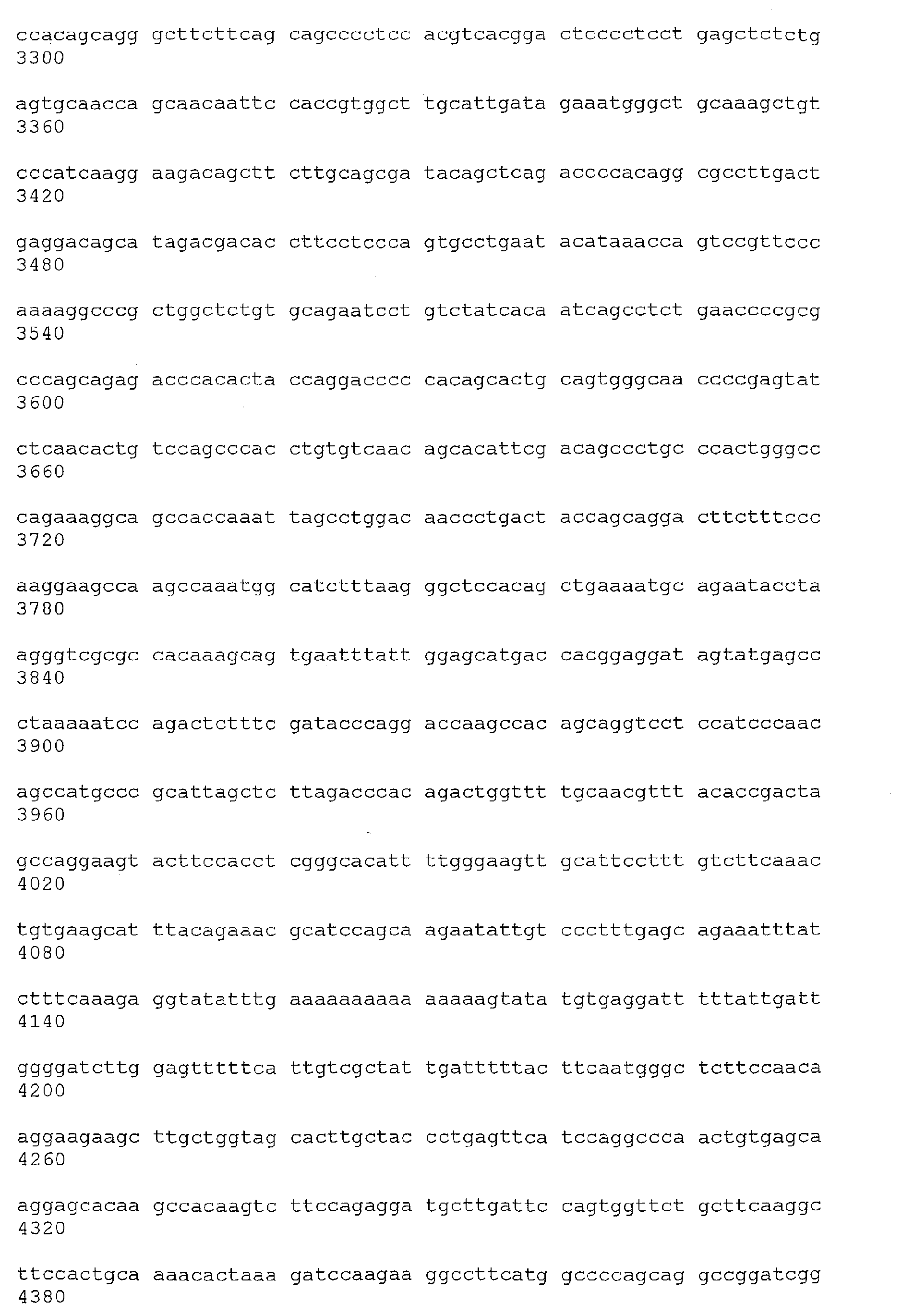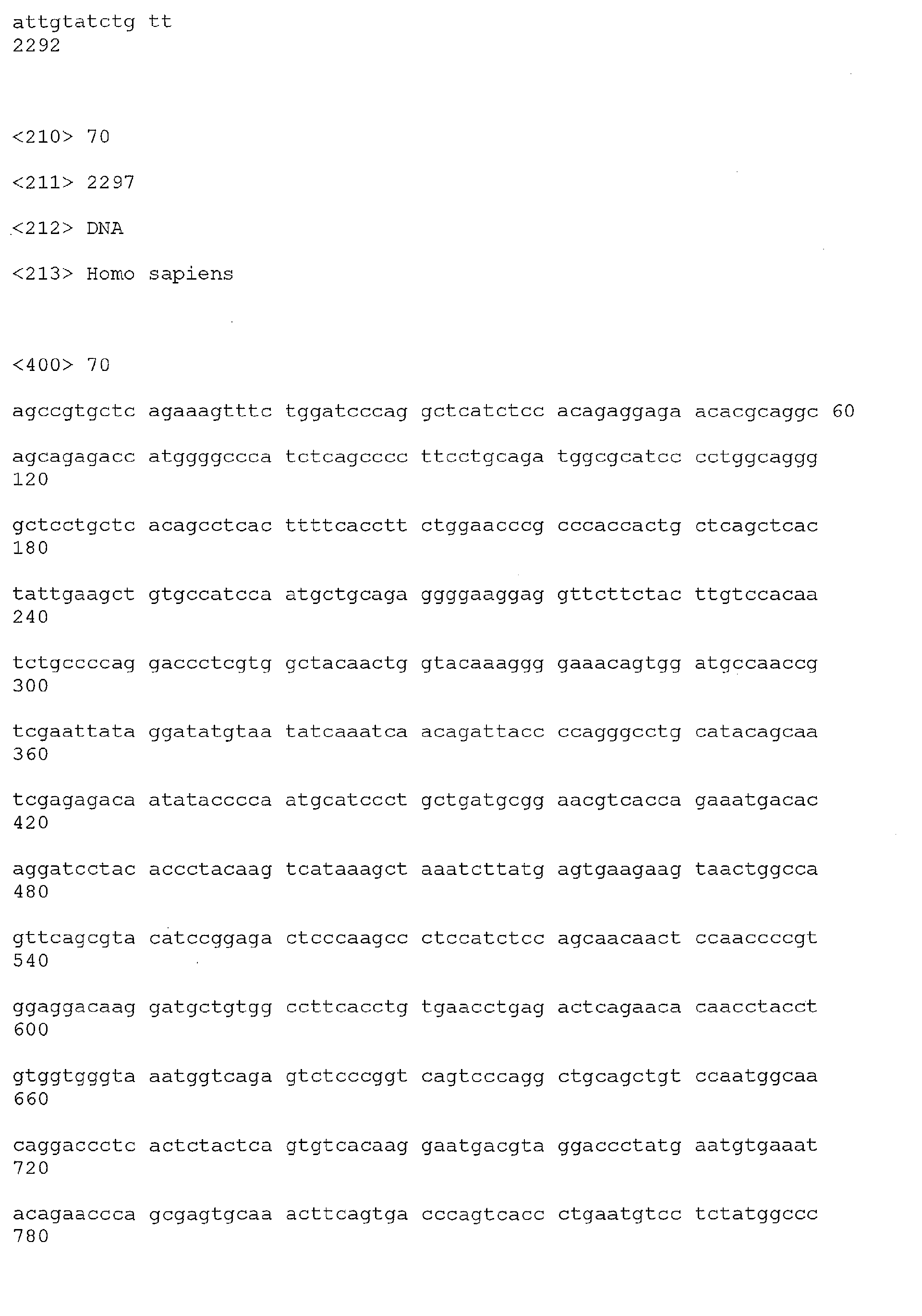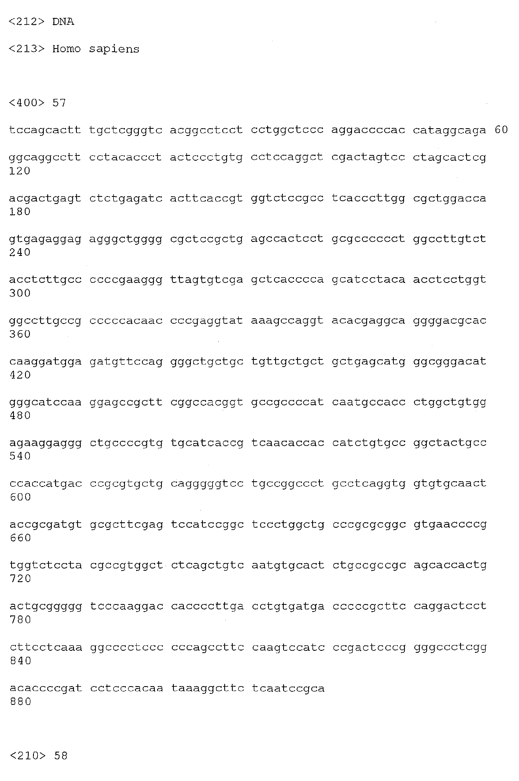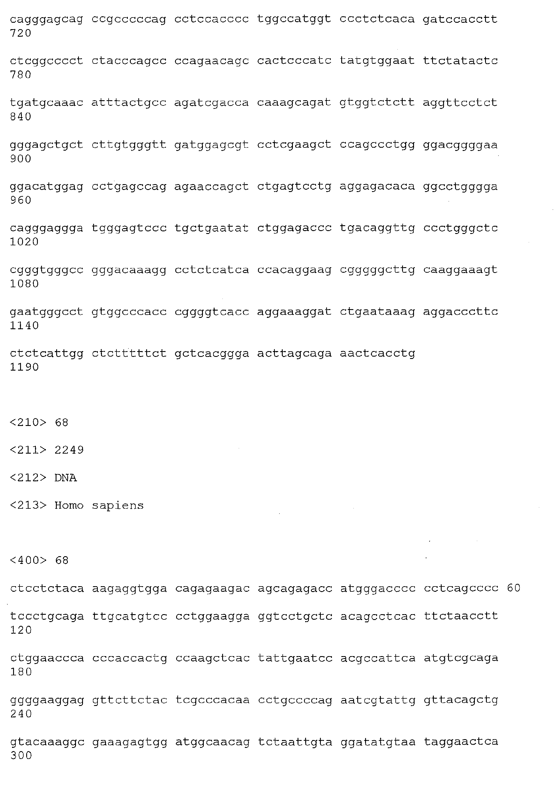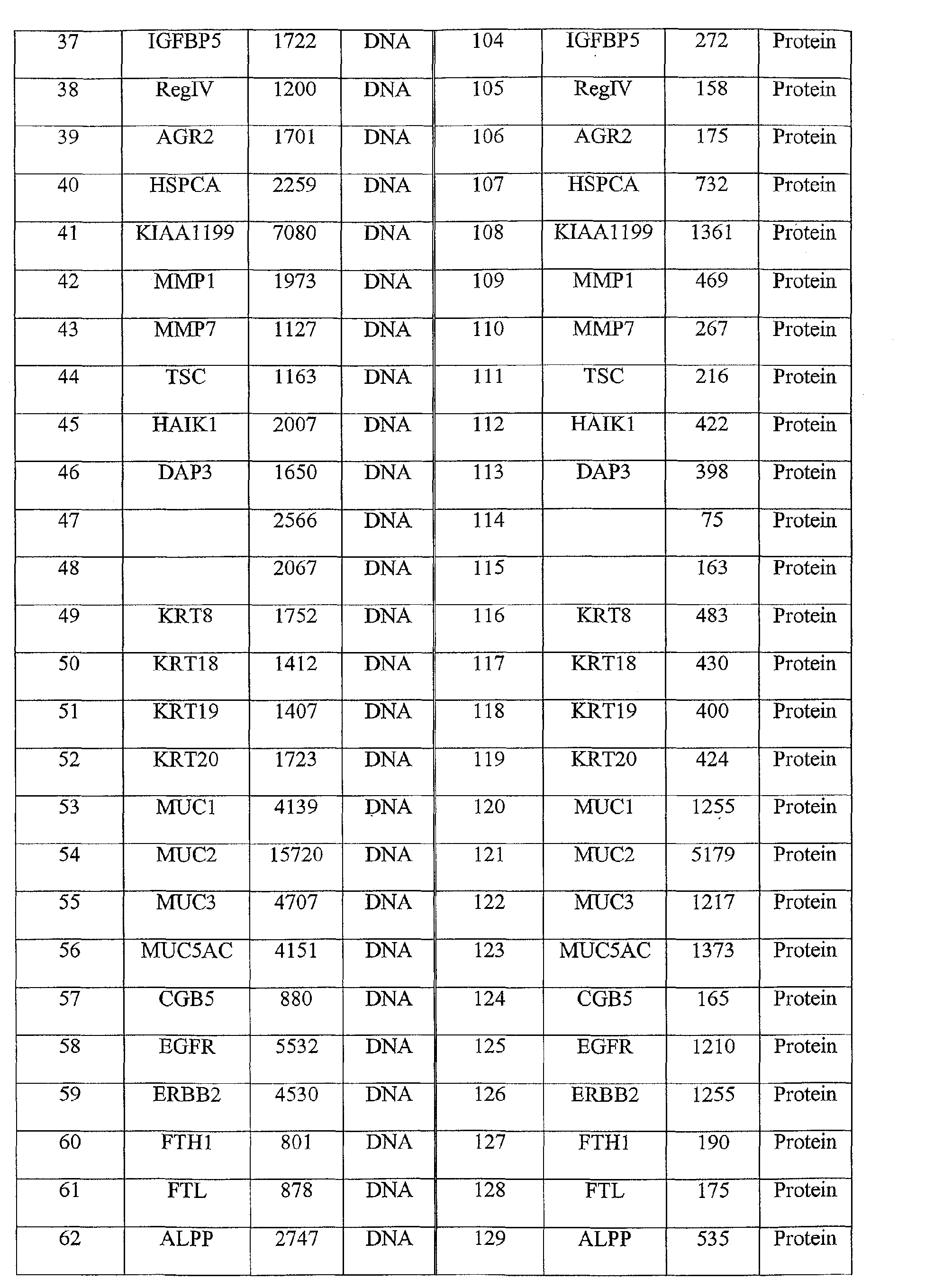 - the colorectal cancer associated marker may comprise, for example, one or more of the nucleic acid sequences of SEQ ID Nos 1, 3, or 5-71, or the amino acid sequences of SEQ ID Nos 2, 4, or 72-138, or derivatives or homologs thereof having substantially the same binding specificity.