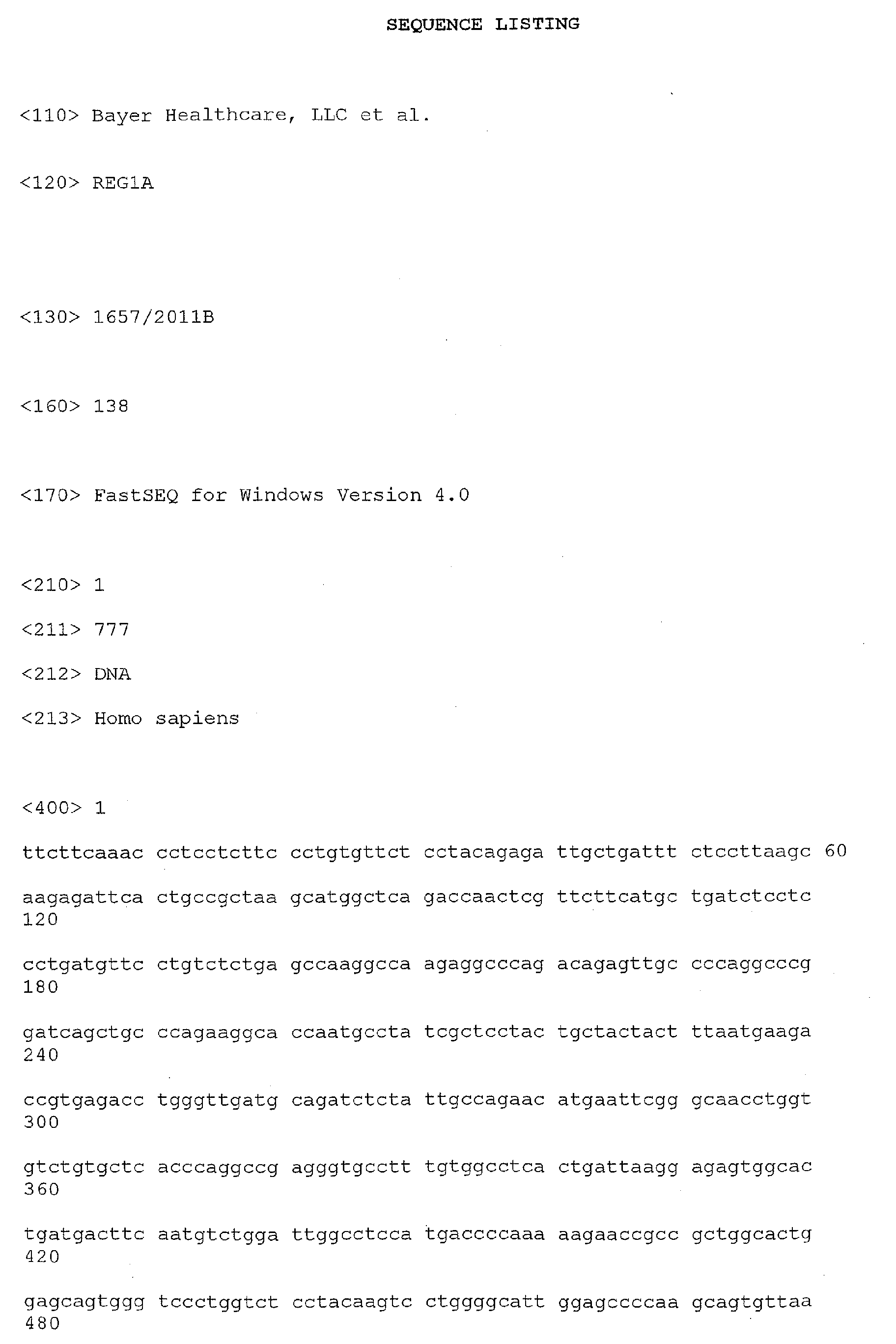 - detecting refers to detecting the presence of a target nucleic acid molecule (e.g., a nucleic acid molecule encoding Reg1 ⁇ , or other colorectal cancer-specific sequence) refers to a process wherein the signal generated by a directly or indirectly labeled probe nucleic acid molecule (capable of hybridizing to a target, e.g., a sequence encoding Reg1 ⁇ , in a serum sample) is measured or observed.