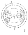 - wheels 10 being engaged with wheels 9 result in the increase of torque in the shafts 19 of wheels 9 ⁇ 9a, as the wheels 9a move around the circumference of the first fixed ring 6 and they simultaneously perform a rotation around their own axis.