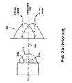 - Prior art Figure 2A shows two LEDs 210a and 210b that are mounted along a vertical axis (axis not shown) under a single spherical lens 215 and the resulting light intensity profiles 220.