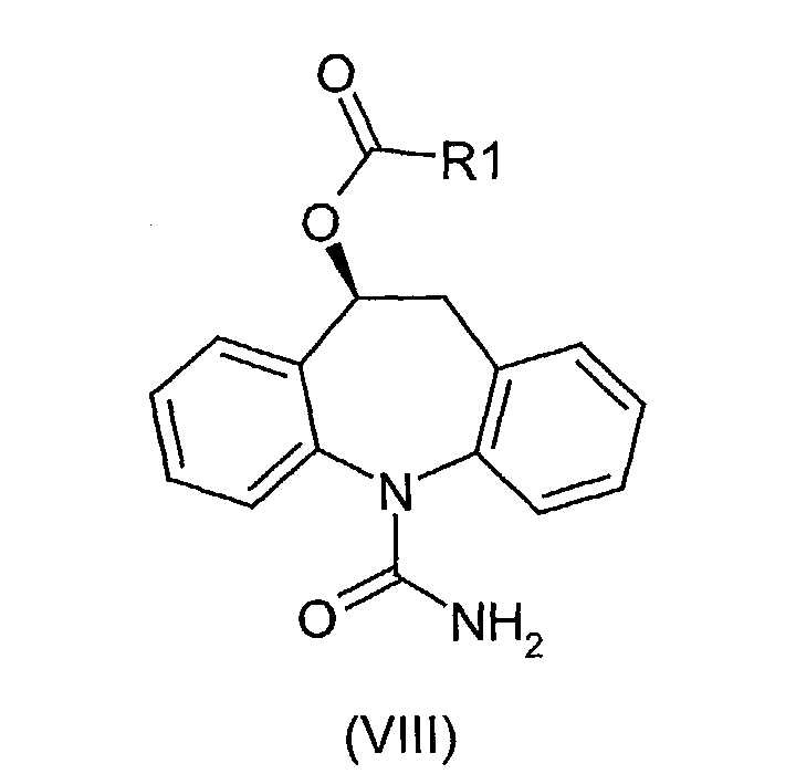 - According to another aspect of the invention, there is provided a method for the preparation of a compound of the general formula (VIII): where R1 is hydrogen, alkyl, halogenalkyl, aralkyl, cycloalkyl, cycloalkylalkyl, alkoxy, aryl, or pyridyl; the term alkyl means a straight or branched hydrocarbon chain containing from 1 to 18 carbon atoms; the term halogen means fluorine, chlorine, bromine or iodine; the term cycloalkyl means an alicyclic saturated group with 3 to 6 carbon atoms; and the term aryl means an unsubstituted phenyl group or phenyl substituted by alkoxy, halogen or nitro group, said method comprising forming racemic (±)-10,11-dihydro-10-hydroxy-5H-dibenz/b,f/azepine-5-carboxamide from optically pure or optically enriched (R)-(-)-10,11-dihydro-10-hydroxy-5H-dibenz/b,f/azepine-5-carboxamide (II) by a process as described above, then treating the racemic (±)-10,11-dihydro-10-hydroxy-5H-dibenz/b,f/azepine-5-carboxamide to produce the compound of formula (VIII).