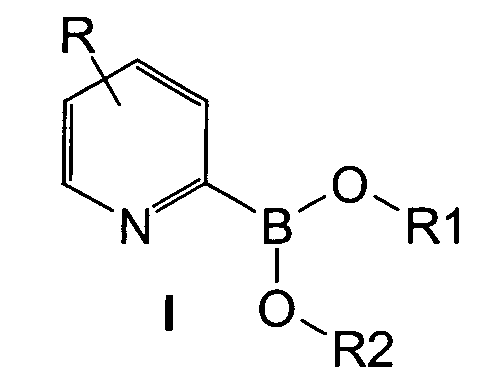 - Verfahren zur Herstellung von 2-Pyridinboronsäureestern der Formel I, durch Umsetzung eines 2-Halogenpyridins (II) mit einem Metallierungsreagenz zu einer Organometallverbindung (III) (Schritt 1), anschließender Reaktion von (III) mit einem geeignetem Borsäureester (IV) zu Pyridin-Borkomplexsalzen (V) (Schritt 2), und abschließender Umsetzung der Komplexsalze (V) mit einer Protonenquelle unter Abspaltung eines Esterrestes am Bor zu 2-Pyridinboronsäureestern der Formel (I), wobeiX H, Cl, Br, I oder F ist;M Li oder MgHal (Hal = Cl, Br) bedeutet;R für H, F, Cl, Br, I, einen verzweigten oder unverzweigten C1-C20-Alkyl- oder Alkoxyrest, einen gegebenenfalls substituierten C6 bis C12-Arylrest oder einen Heteroarylrest, einen substituierten oder unsubstituierten Cycloalkylrest mit 3 bis 8 C-Atomen, Heteroaryloxy, Aryloxy, Dialkylamino, Diarylamino, Alkylthio, Arylthio oder für eine Cyano-, Ester-, Acetal, Mono- oder Dithioacetal oder Aminalgruppe steht; die Reste R1, R2, R3 stehen unabhängig voneinander für einen verzweigten oder unverzweigten C1-C20-Alkyl- oder Alkoxyrest, einen Cycloalkyl-, Alkenyl-, Alkinyl- oder Heteroarylrest oder einen gegebenenfalls substituierten C6 bis C12-Arylrest oder zwei Reste R1 bis R3 bilden zusammen einen Ring.