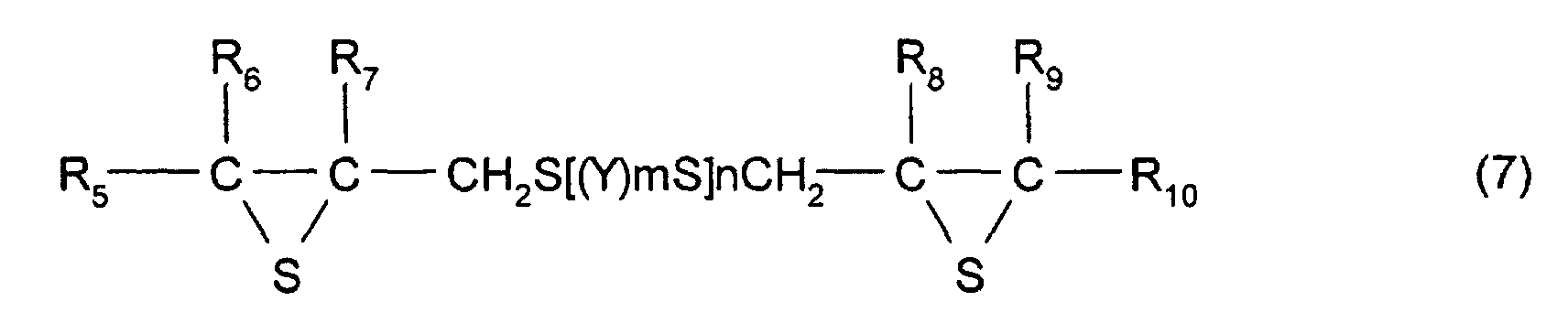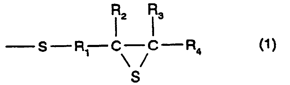 - a compound having the structure represented by formula (1), and, in particular, a compound may be used which has at least three functionalities and which comprises a 2,3-epithiopropylthio group as a substituent group; however, a compound having two functionalities is more preferable.
