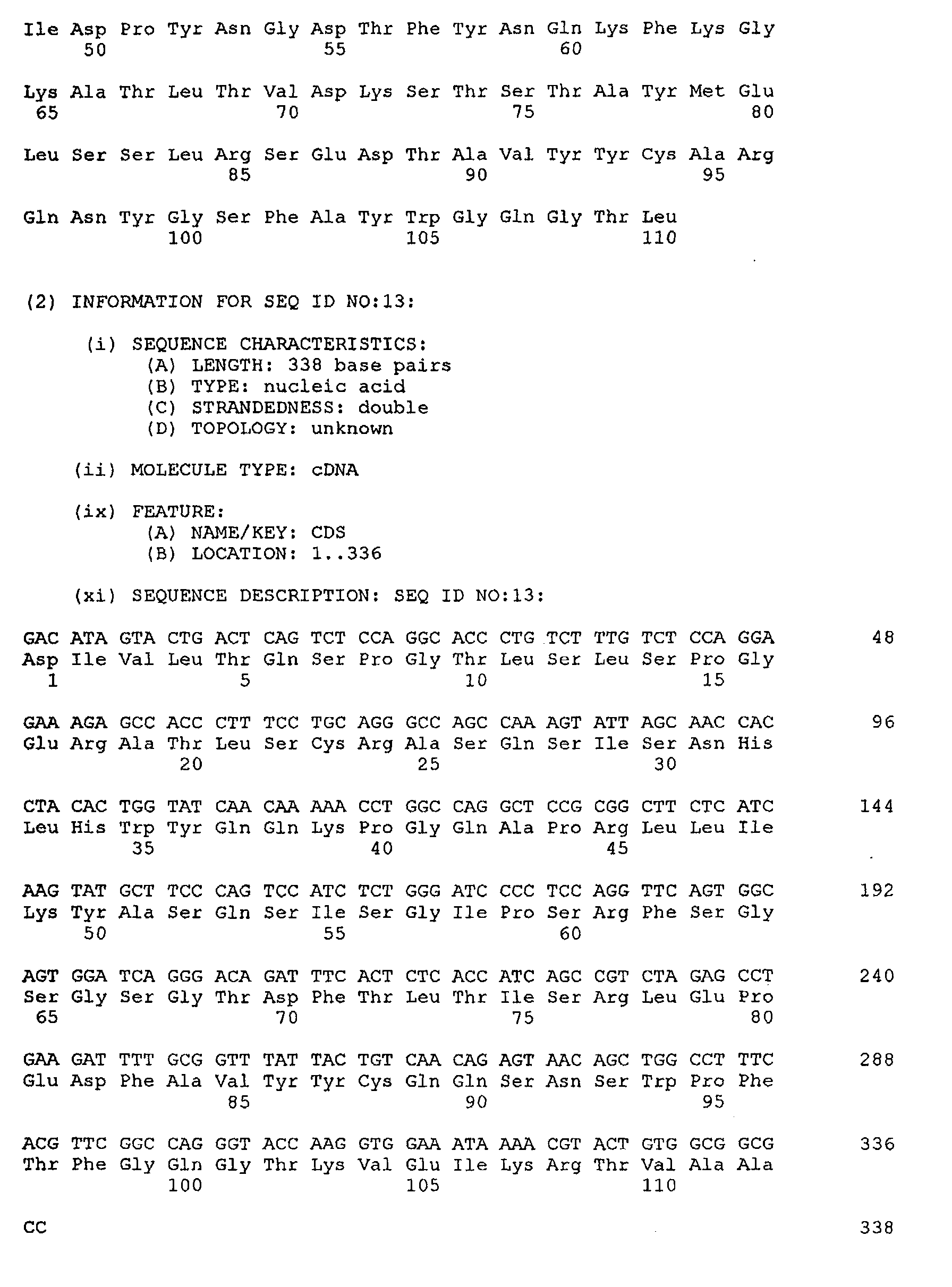 - Sequence ID Nos. 13 and 14 are the DNA and amino acid sequences, respectively, of the region of the murine D12 light chain variable region being altered, including the first five amino acids of the human kappa constant region.