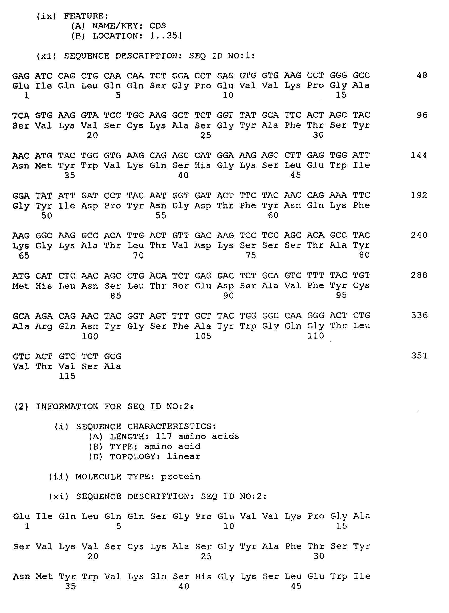 - Sequence ID Nos. 1 and 2 are the heavy chain variable region DNA and amino acid sequences, respectively, of murine mAb D12.
