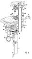 - Fig. 2 and Fig. 3 show the device of Fig. 1 without the housing parts. Shown is a disposed inside the device frame 2 below the mounting plate 3 Motor 11, which is the central drive function of both the workstations 5 and the turntable 4 plays. In the area below the body plate 3 Furthermore, there is still the engine 12 downstream of the transmission and a Overload clutch 13, which will be discussed below. Above the Body plate 3 is the transmission housing 14, in which the movement coupling between the engine 11 and transmission 12 and downstream drive components he follows. Downstream of the transmission housing 14 is the turntable. 4 and the fixed mounting plate 15, on the as described the workstations 5 can be positioned according to the local drilling pattern. These grab on to be described driver in the form of lever arms to appropriate Coupling elements in the form of disc or ring-like Hubtellern on, which are arranged behind suitable trim parts 16.