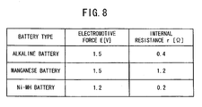 - Fig. 8 is a diagram showing an example of electromotive force and internal resistance of each of various kinds of batteries