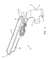 - a depending portion 74 depends generally inboard from the shelf 72 and terminates in a bent under tab 76.