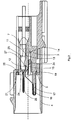 - the first louver elements 22 each contact one of the contact arms 19 with the projection 19a provided in the region of the outwardly angled gate and lift the contact arms 19 on further insertion of the holder 20 in the direction of the rear end 6 by sliding the lugs 19a of the contact arms 19 on the ventilation surfaces 22a, so that they are supported in a direction transverse to the longitudinal axis 1 clearly outside the outlet openings 10 in the front end face 5 on the support surfaces 22b adjoining the ventilation surfaces 22a.