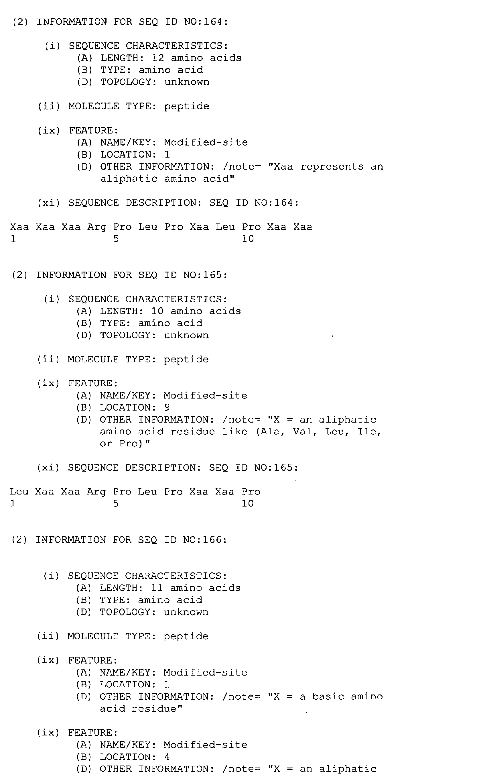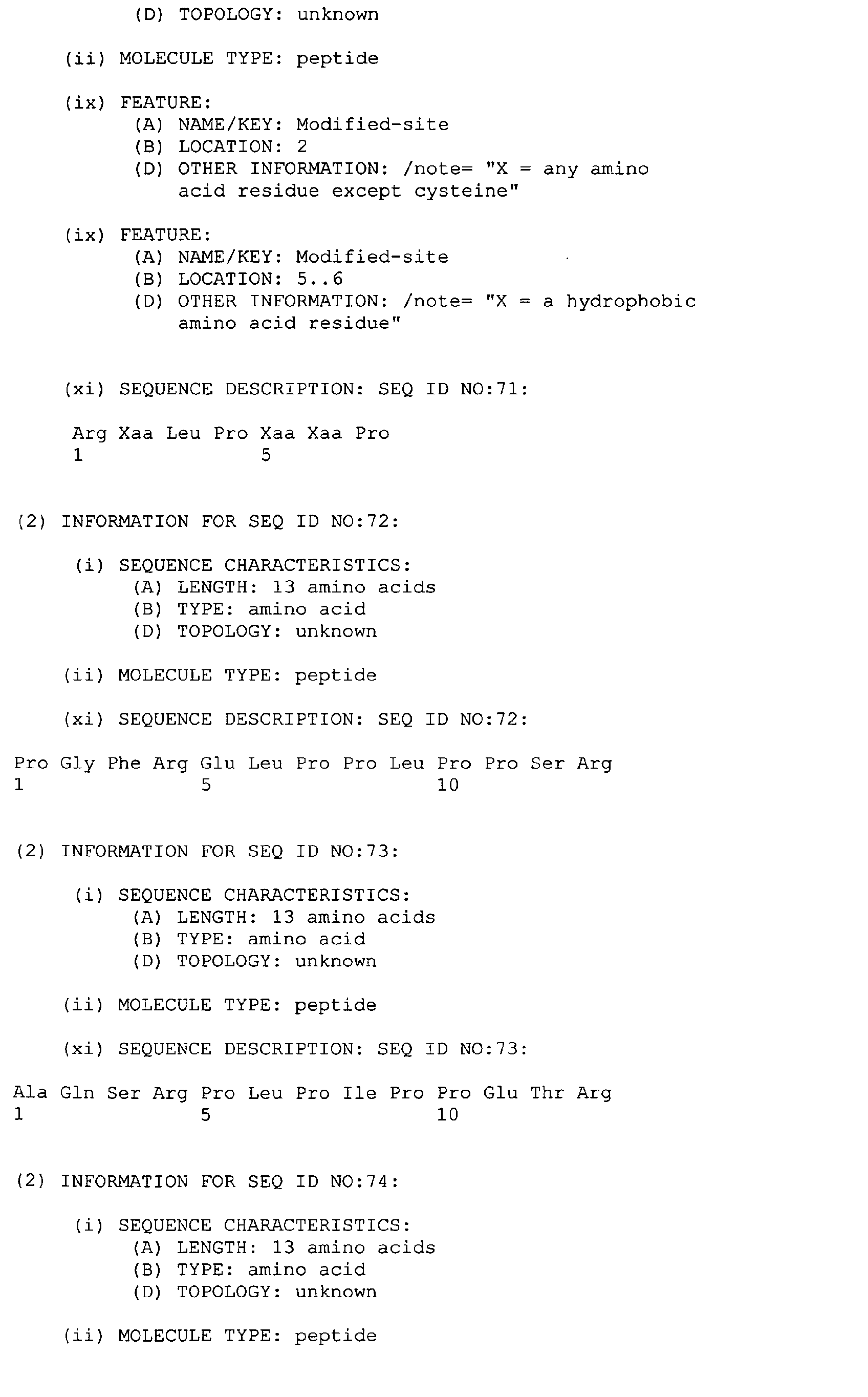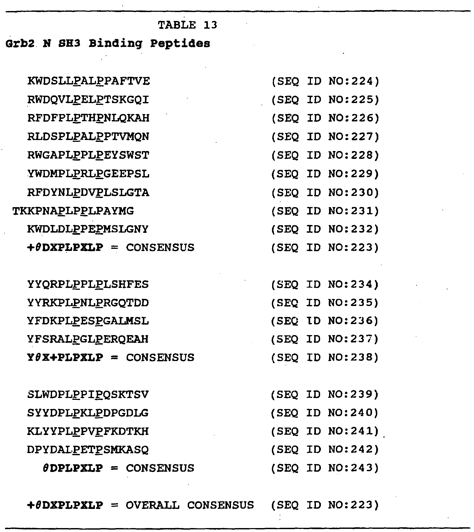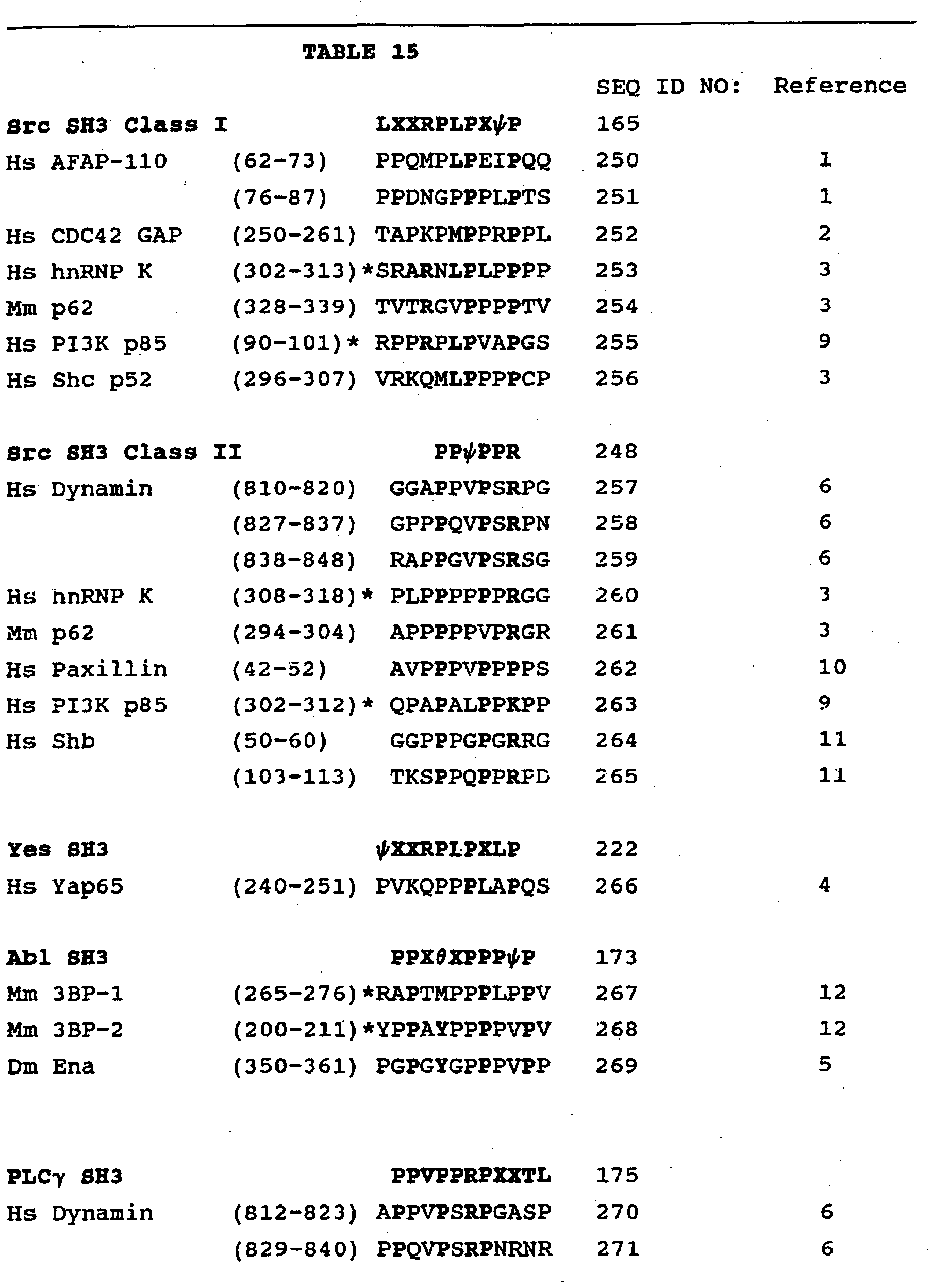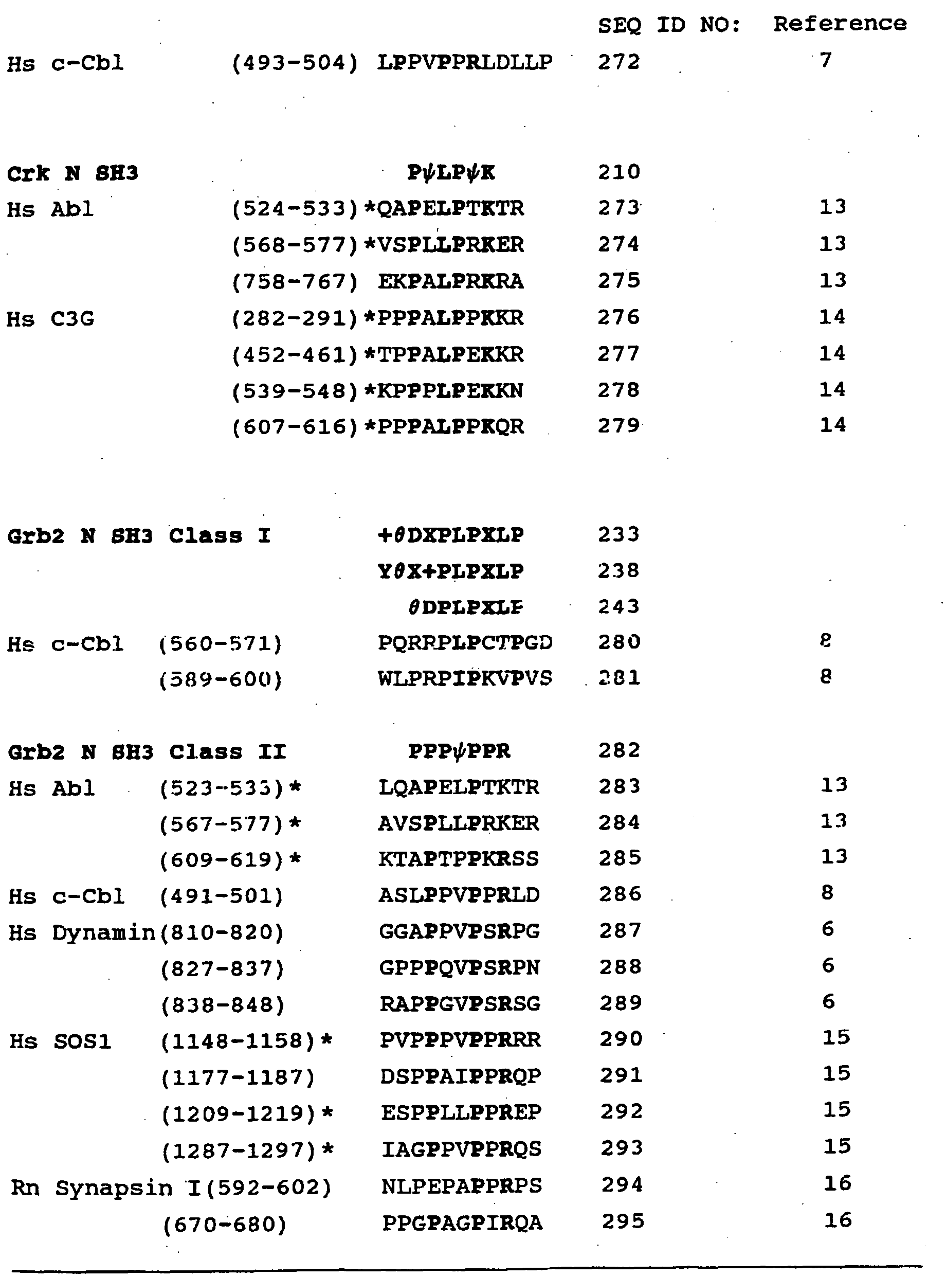 - Yu, et al. (Yu, H., et al., in Cell (1994) 76:933-945) used a "biased" synthetic peptide library of the form XXXPPXPXX (SEQ ID NO:2), wherein X represents any amino acid other than cysteine, to identify a series of peptides which bind the Src and PI-3' Kinase SH3 domains.