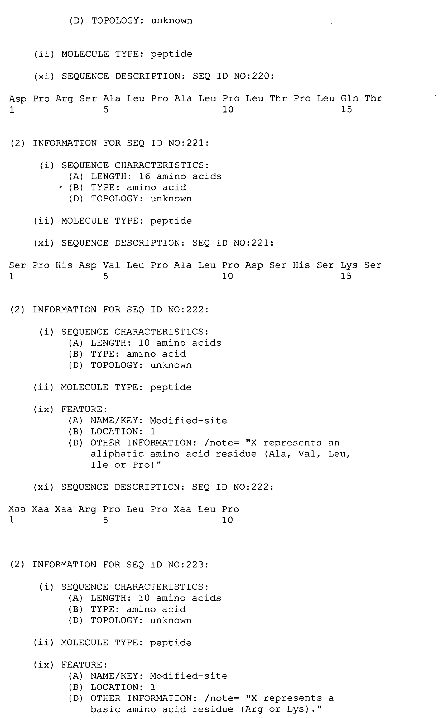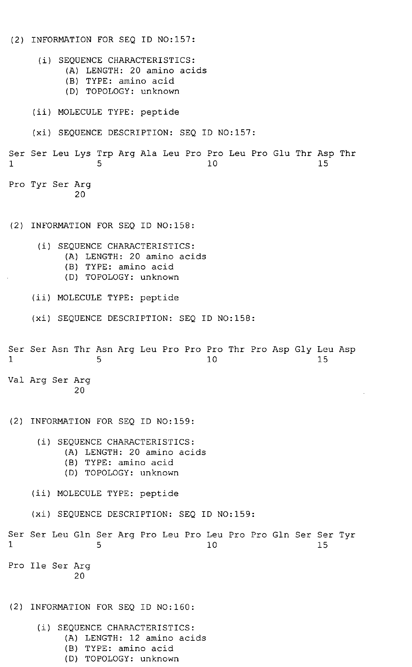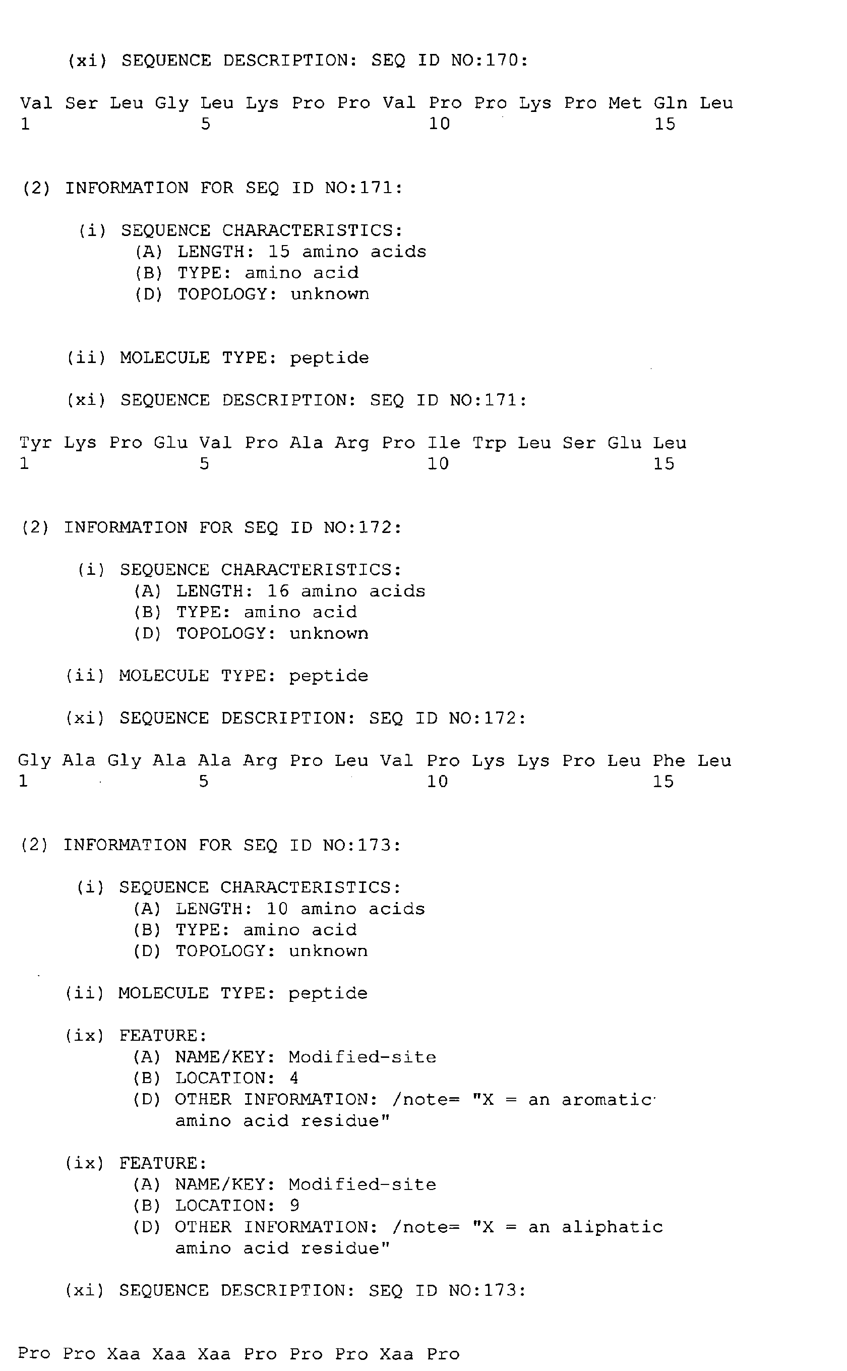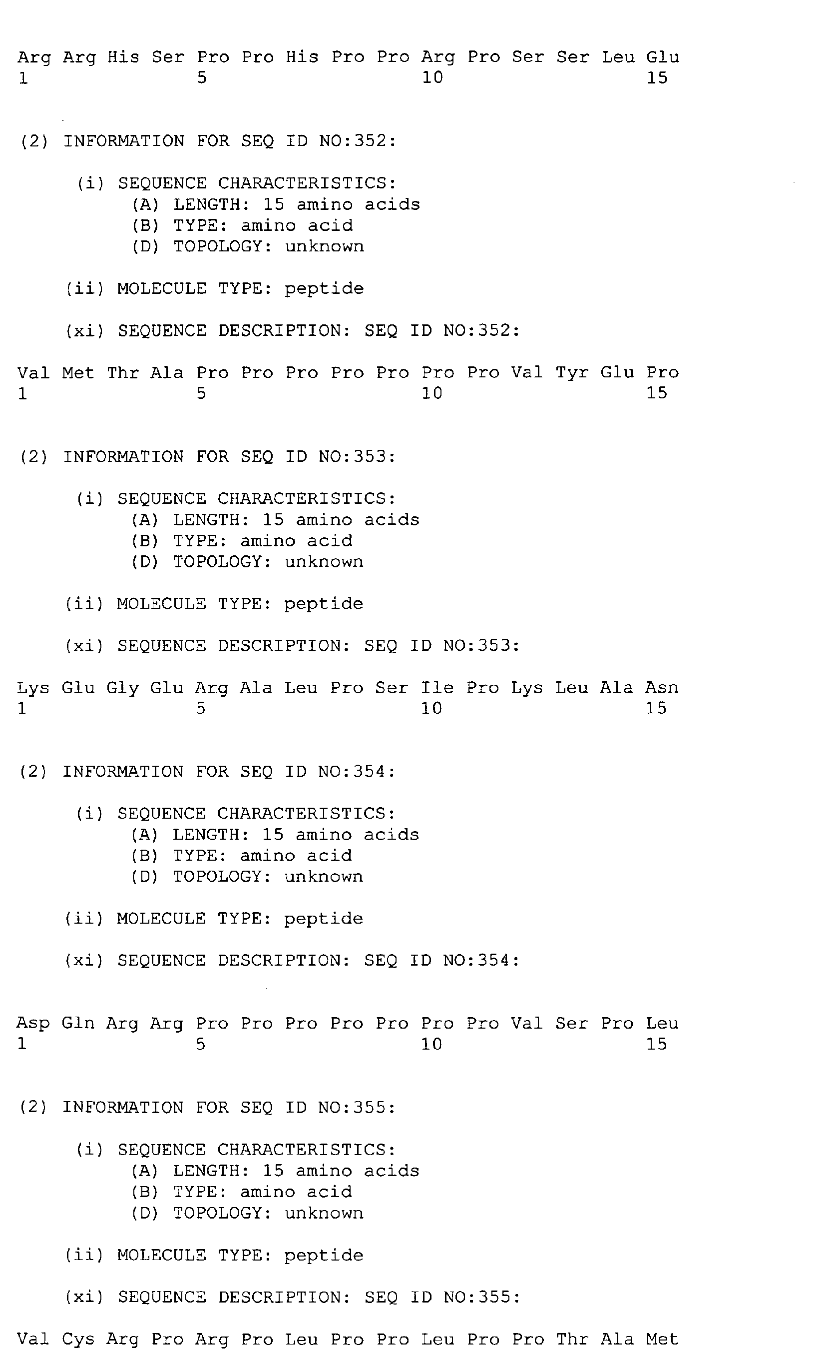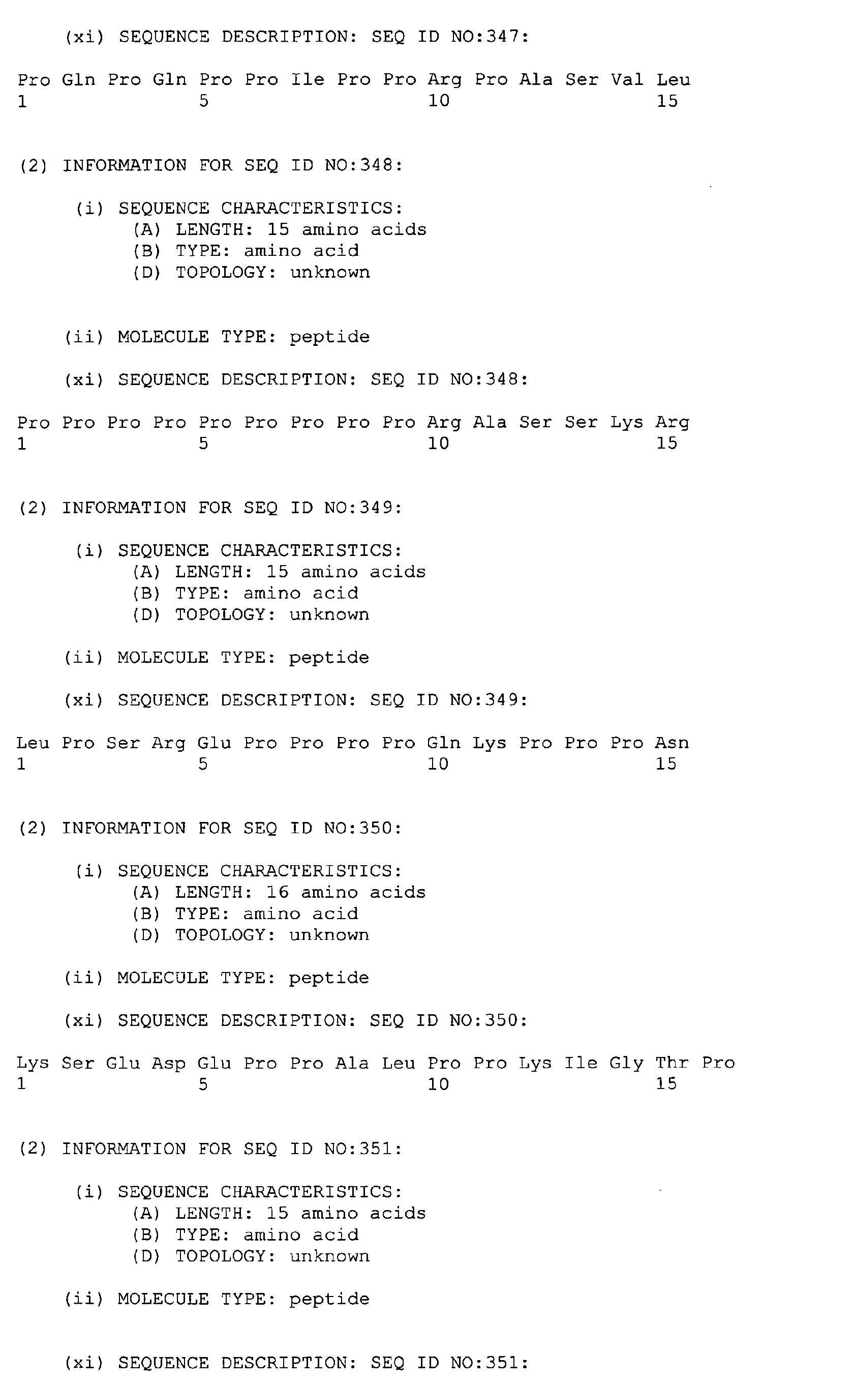 - Yu, et al. (Yu, H., et al., in Cell (1994) 76:933-945) used a "biased" synthetic peptide library of the form XXXPPXPXX (SEQ ID NO:2), wherein X represents any amino acid other than cysteine, to identify a series of peptides which bind the Src and PI-3' Kinase SH3 domains.