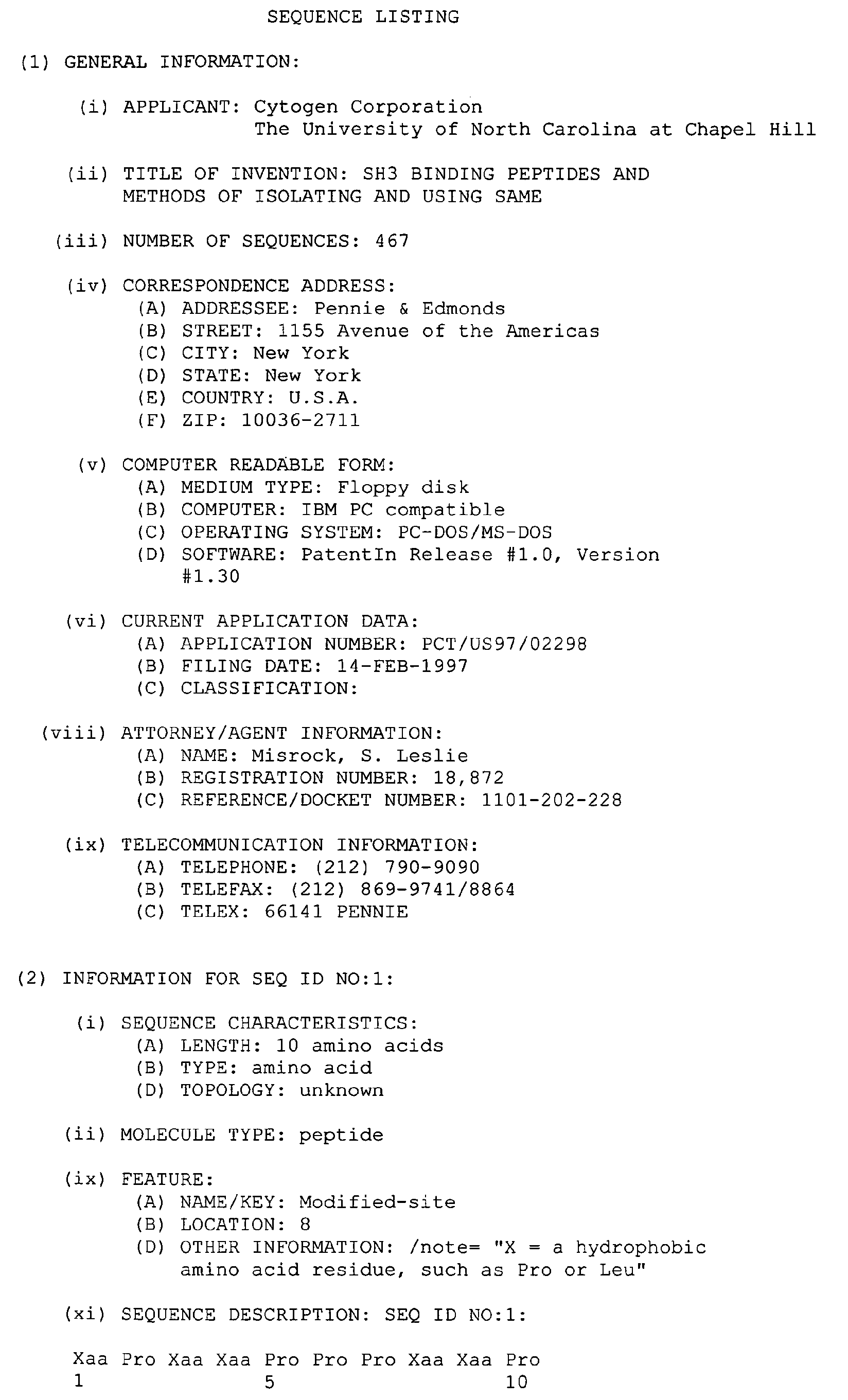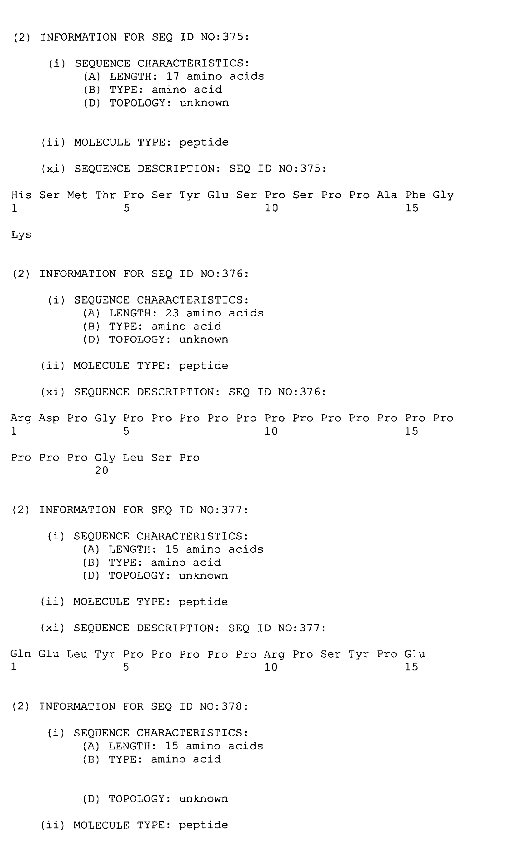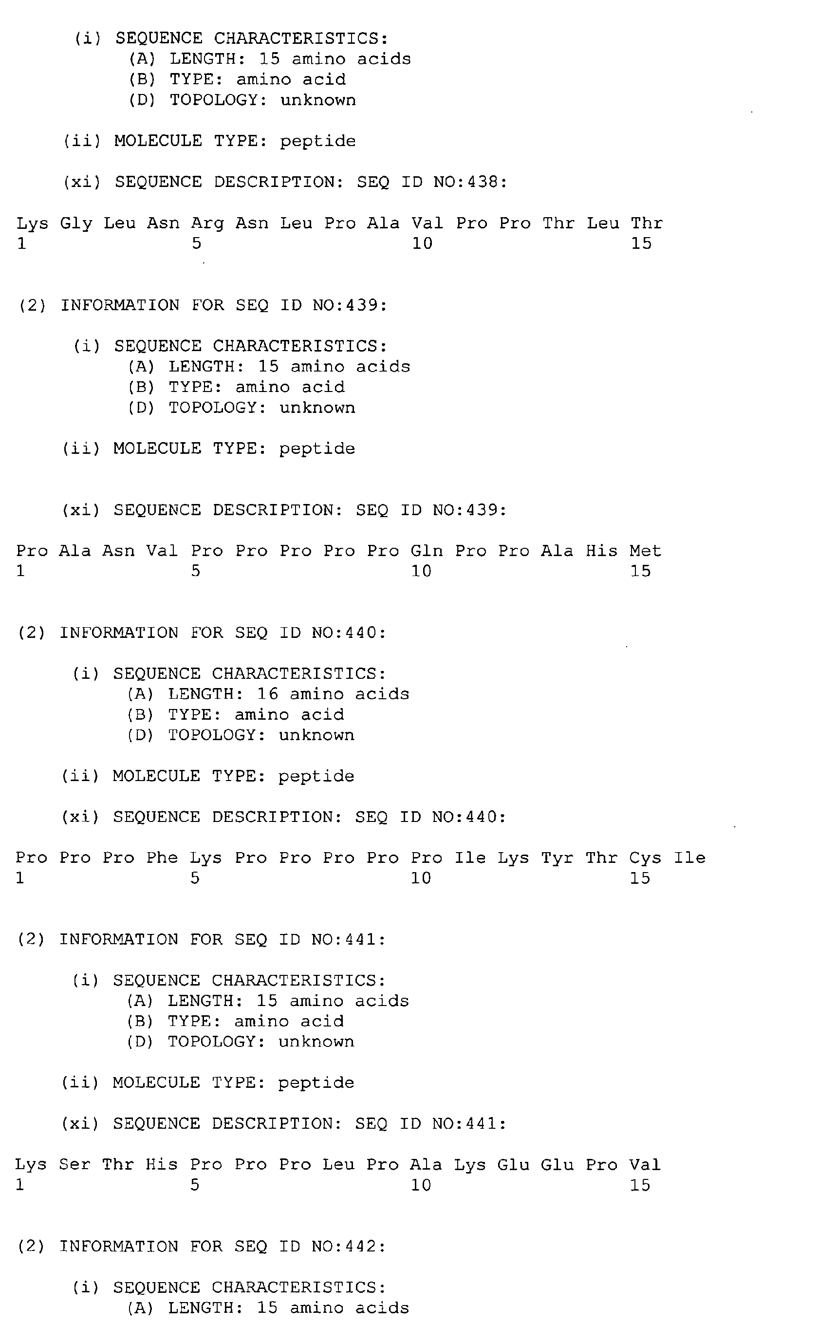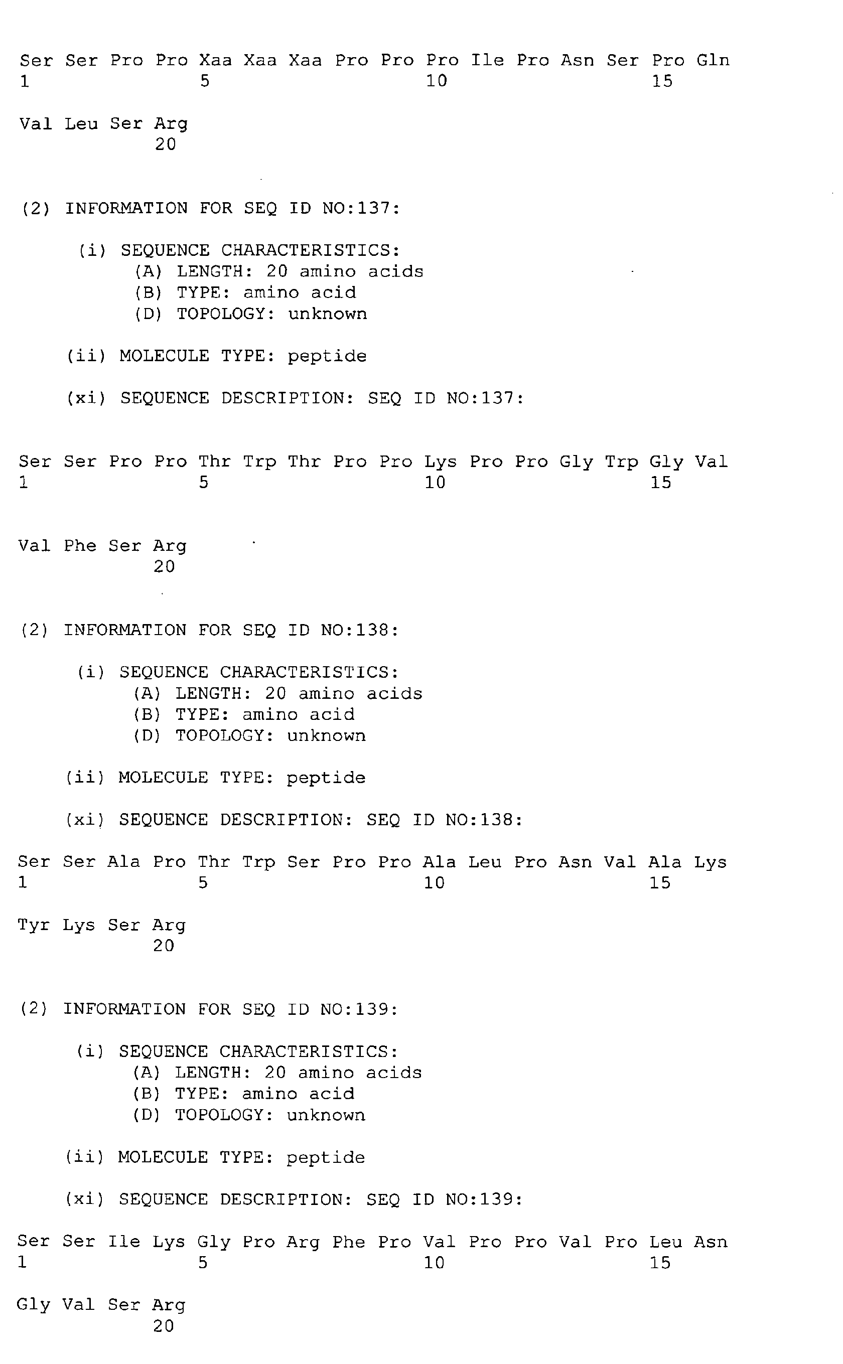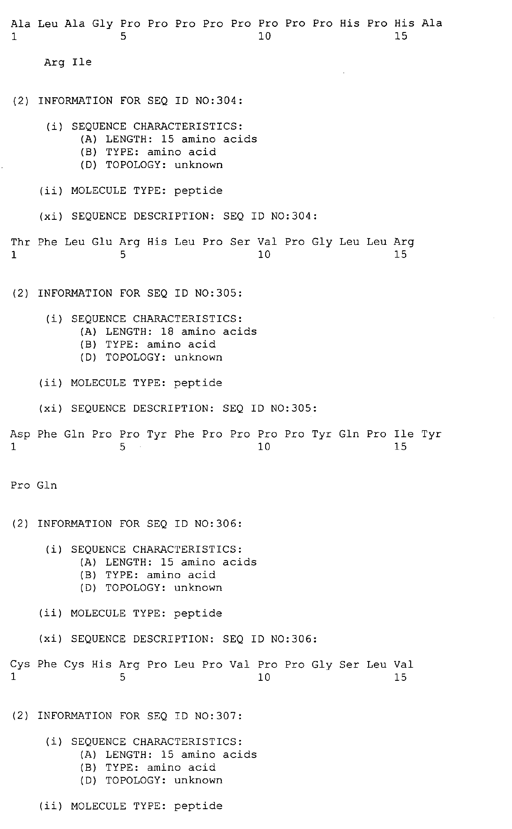 - Yu, et al. (Yu, H., et al., in Cell (1994) 76:933-945) used a "biased" synthetic peptide library of the form XXXPPXPXX (SEQ ID NO:2), wherein X represents any amino acid other than cysteine, to identify a series of peptides which bind the Src and PI-3' Kinase SH3 domains.