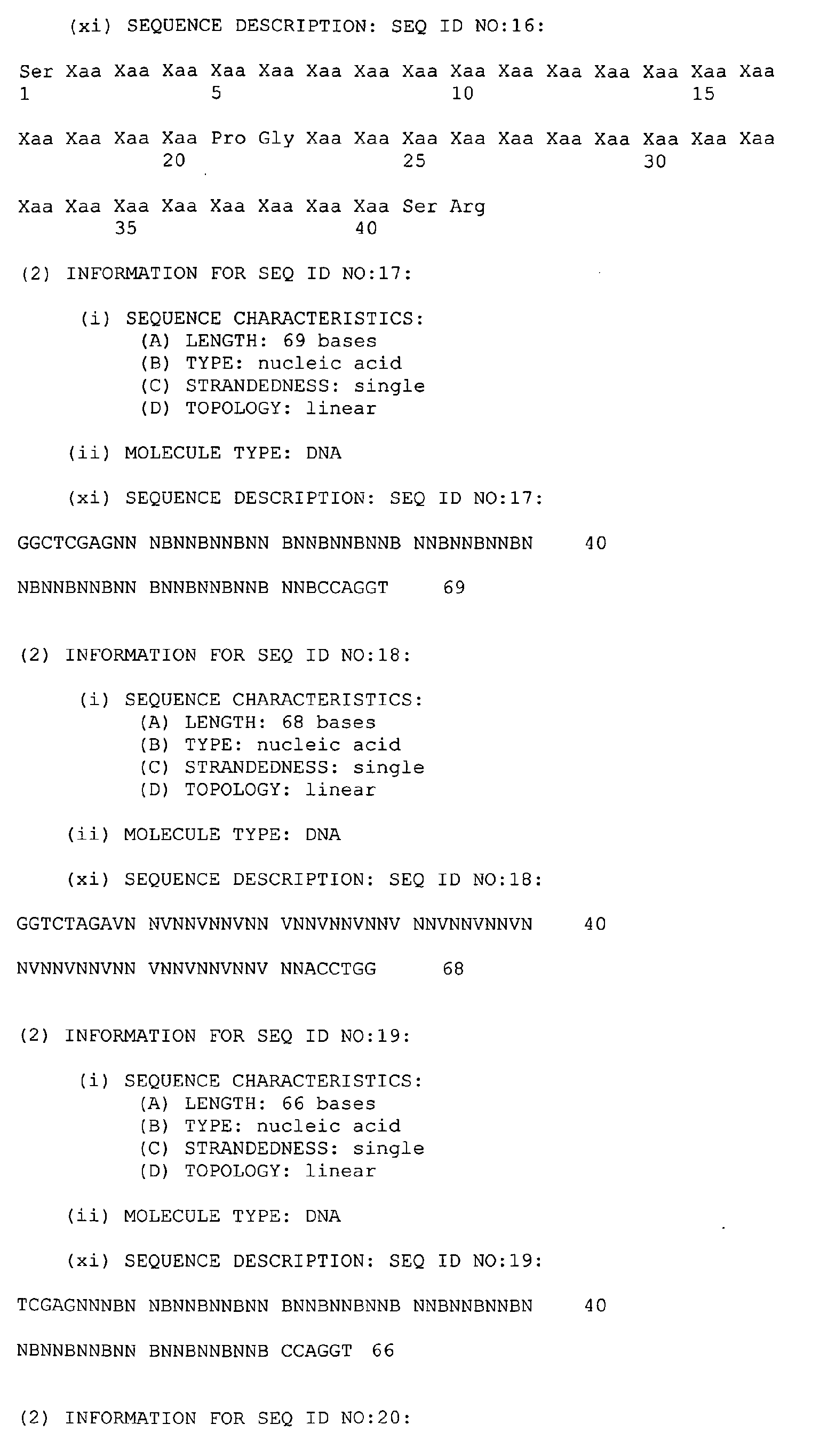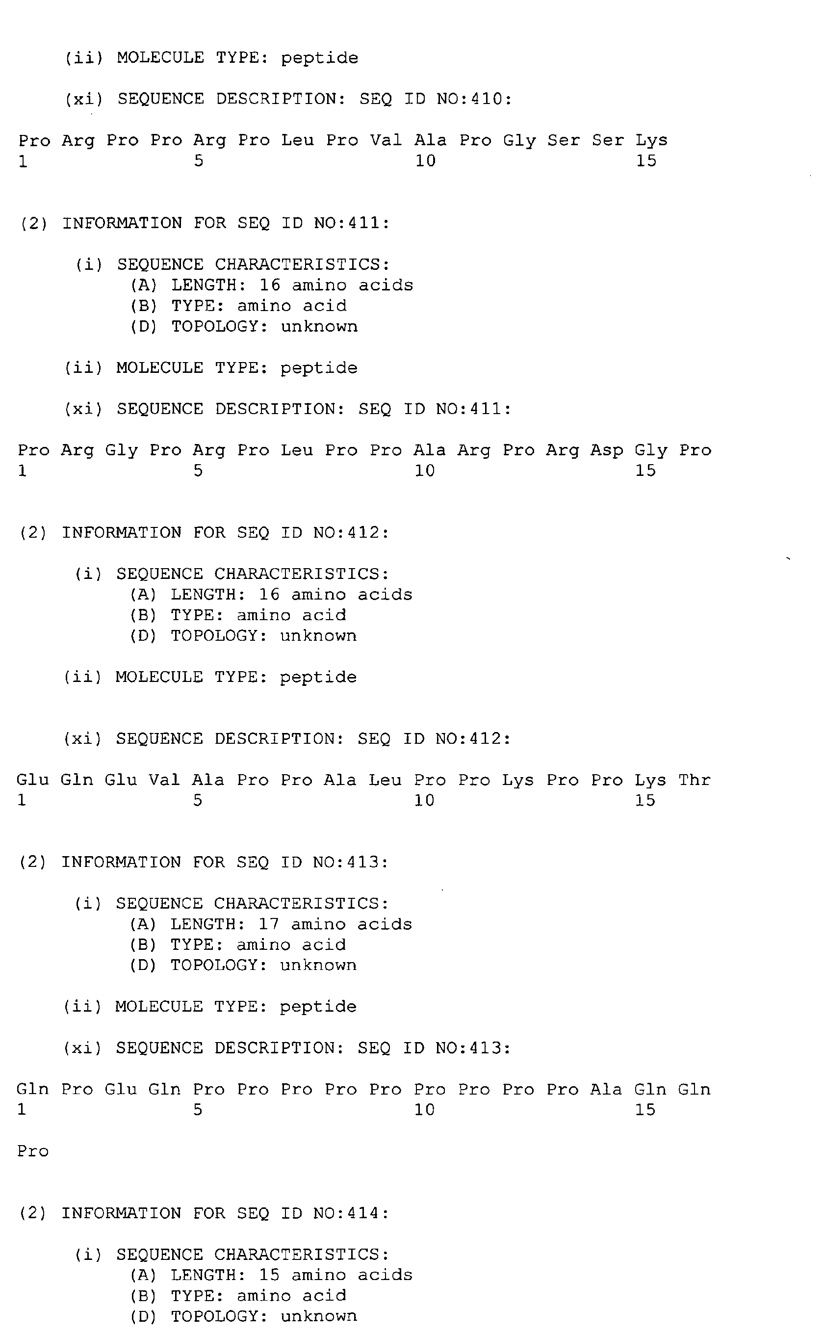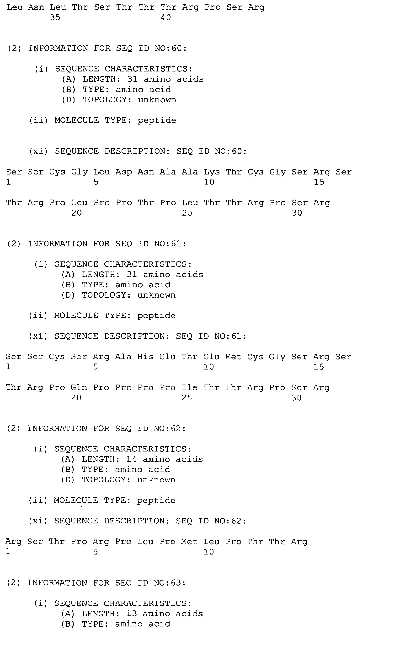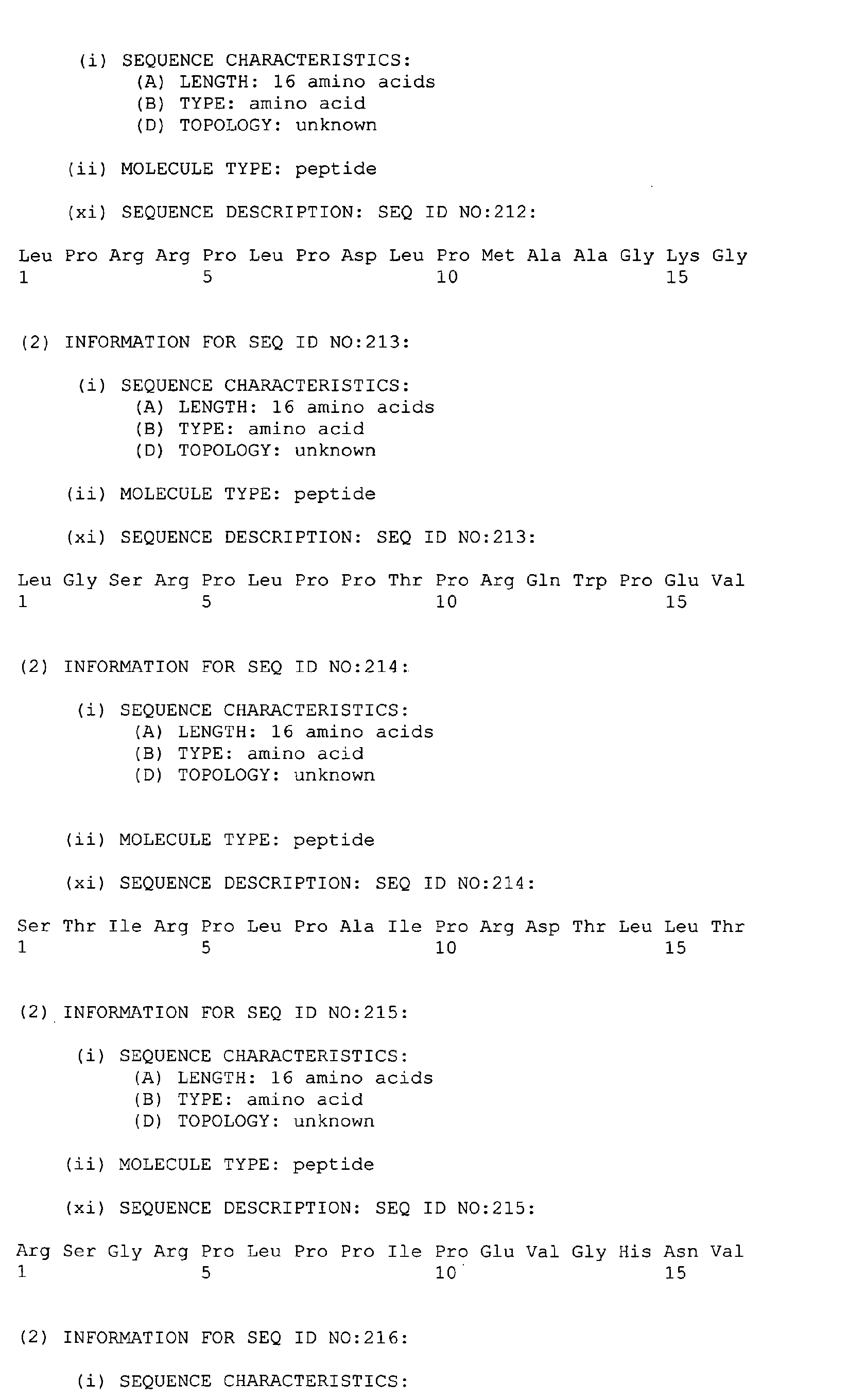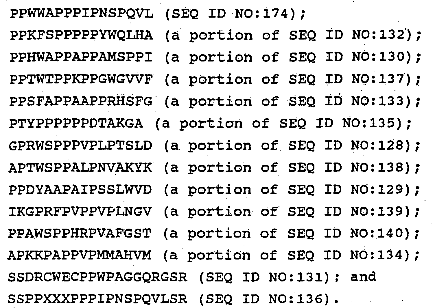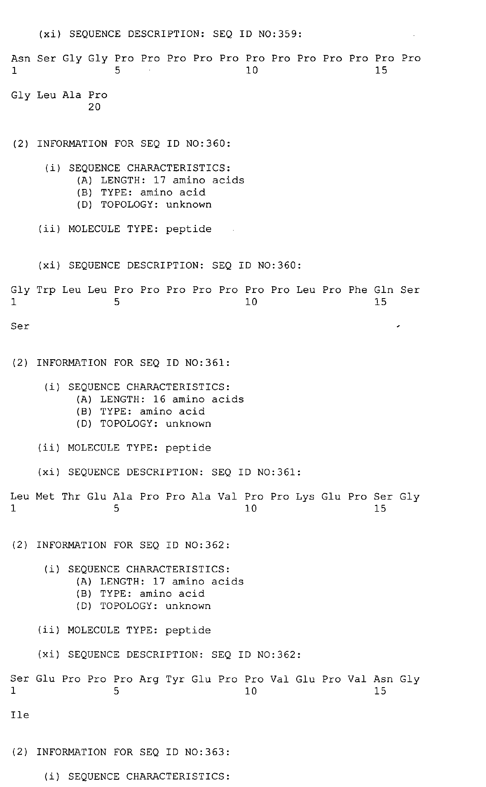 - Yu, et al. (Yu, H., et al., in Cell (1994) 76:933-945) used a "biased" synthetic peptide library of the form XXXPPXPXX (SEQ ID NO:2), wherein X represents any amino acid other than cysteine, to identify a series of peptides which bind the Src and PI-3' Kinase SH3 domains.