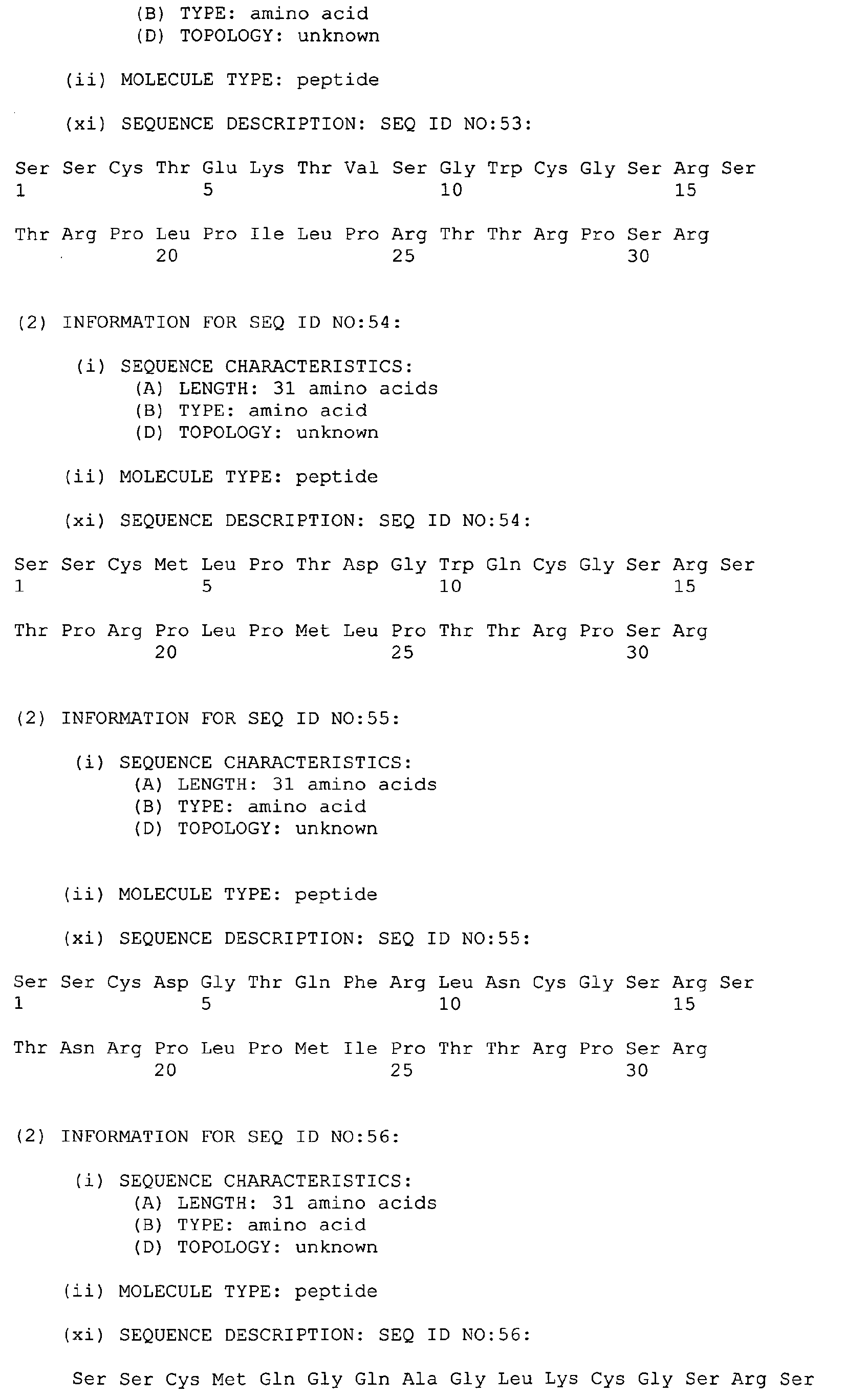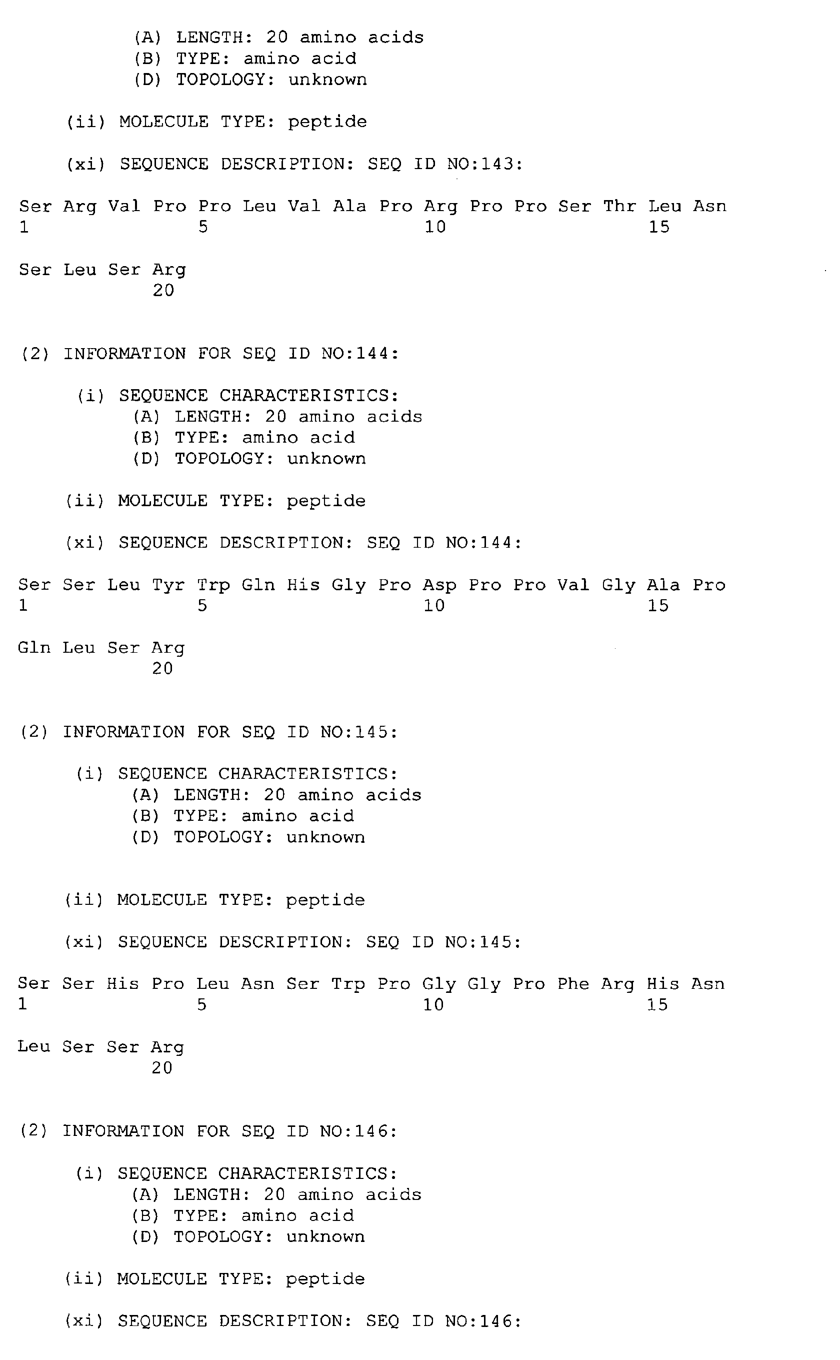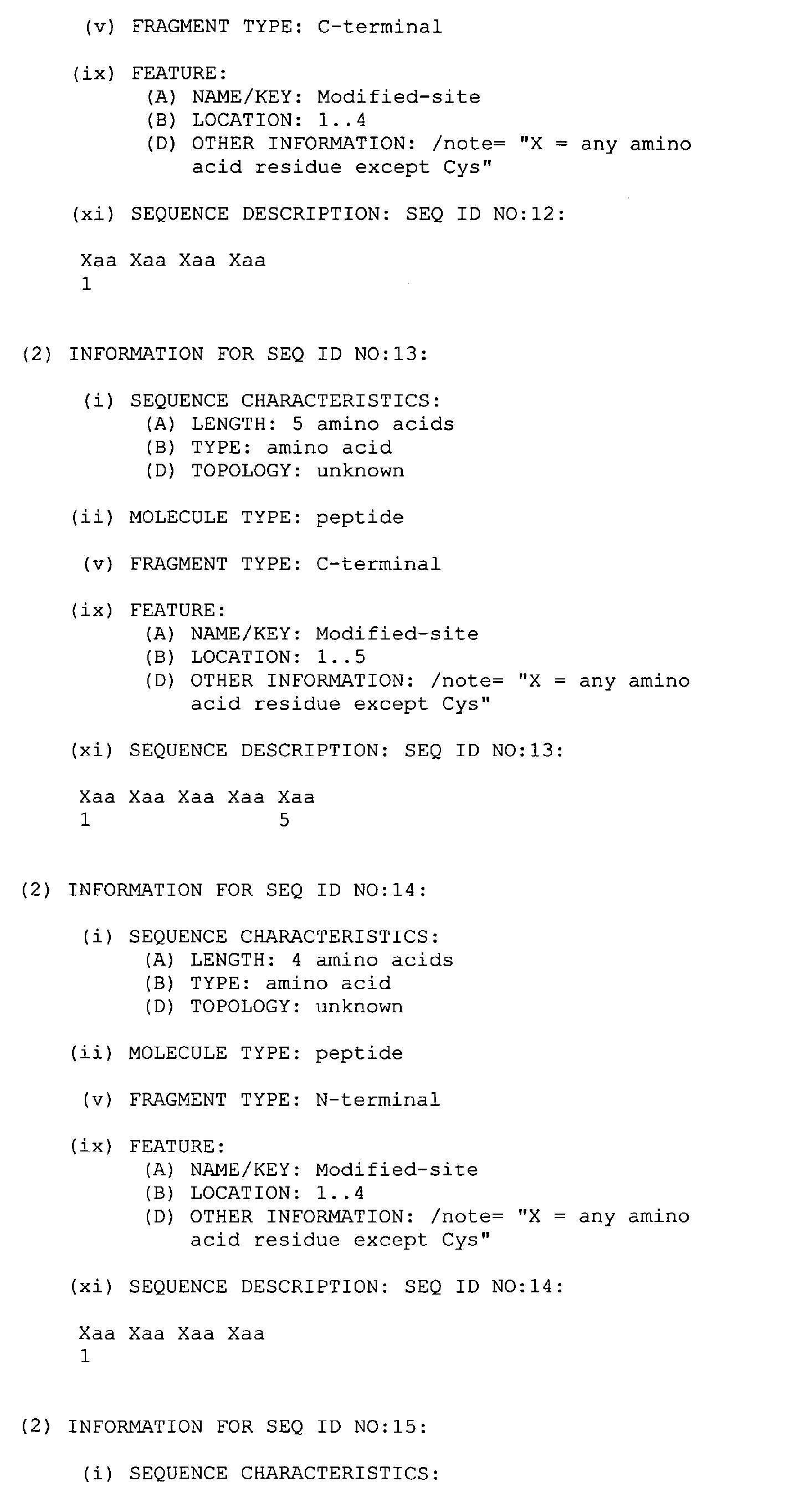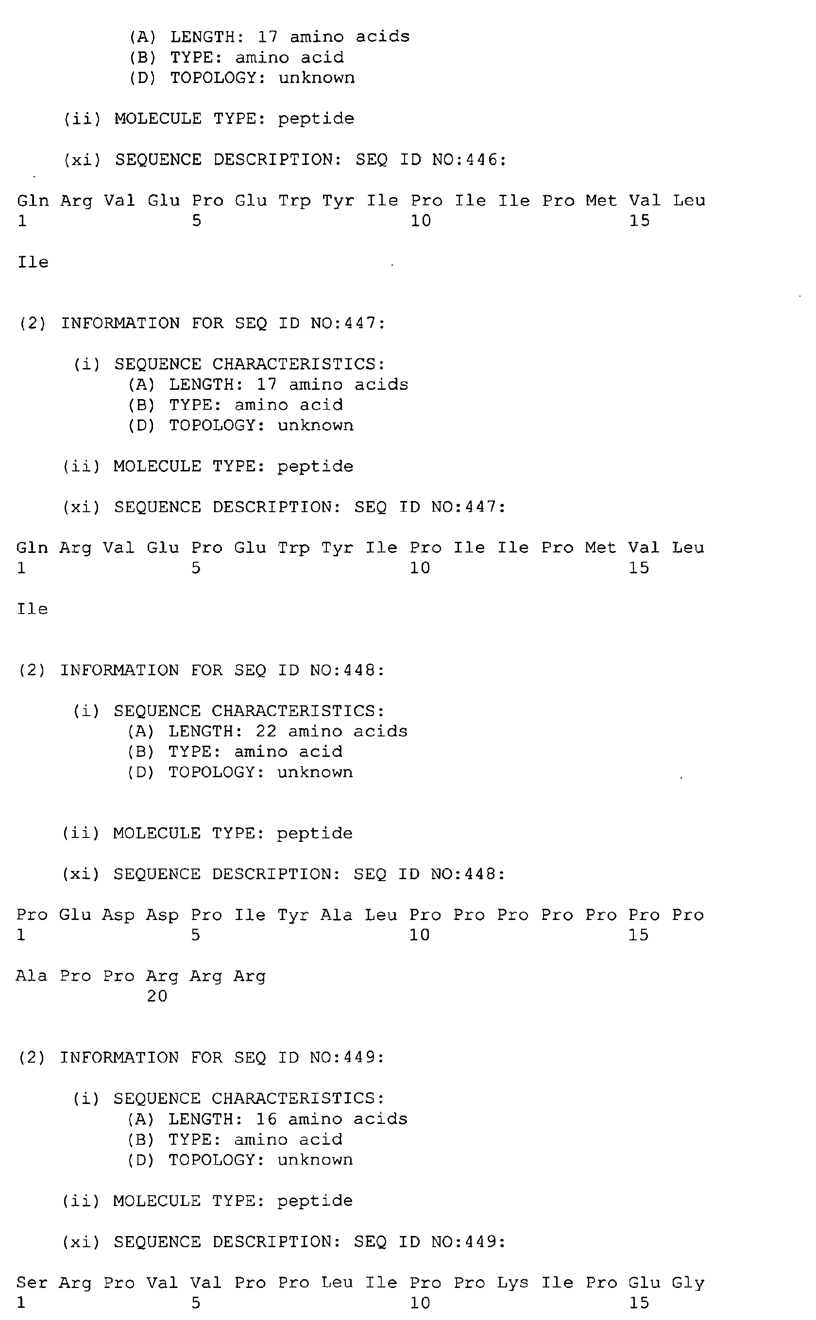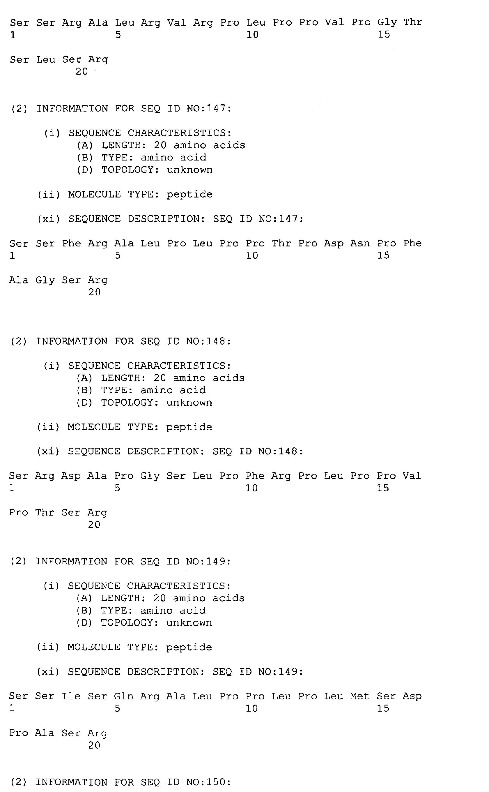 - Yu, et al. (Yu, H., et al., in Cell (1994) 76:933-945) used a "biased" synthetic peptide library of the form XXXPPXPXX (SEQ ID NO:2), wherein X represents any amino acid other than cysteine, to identify a series of peptides which bind the Src and PI-3' Kinase SH3 domains.