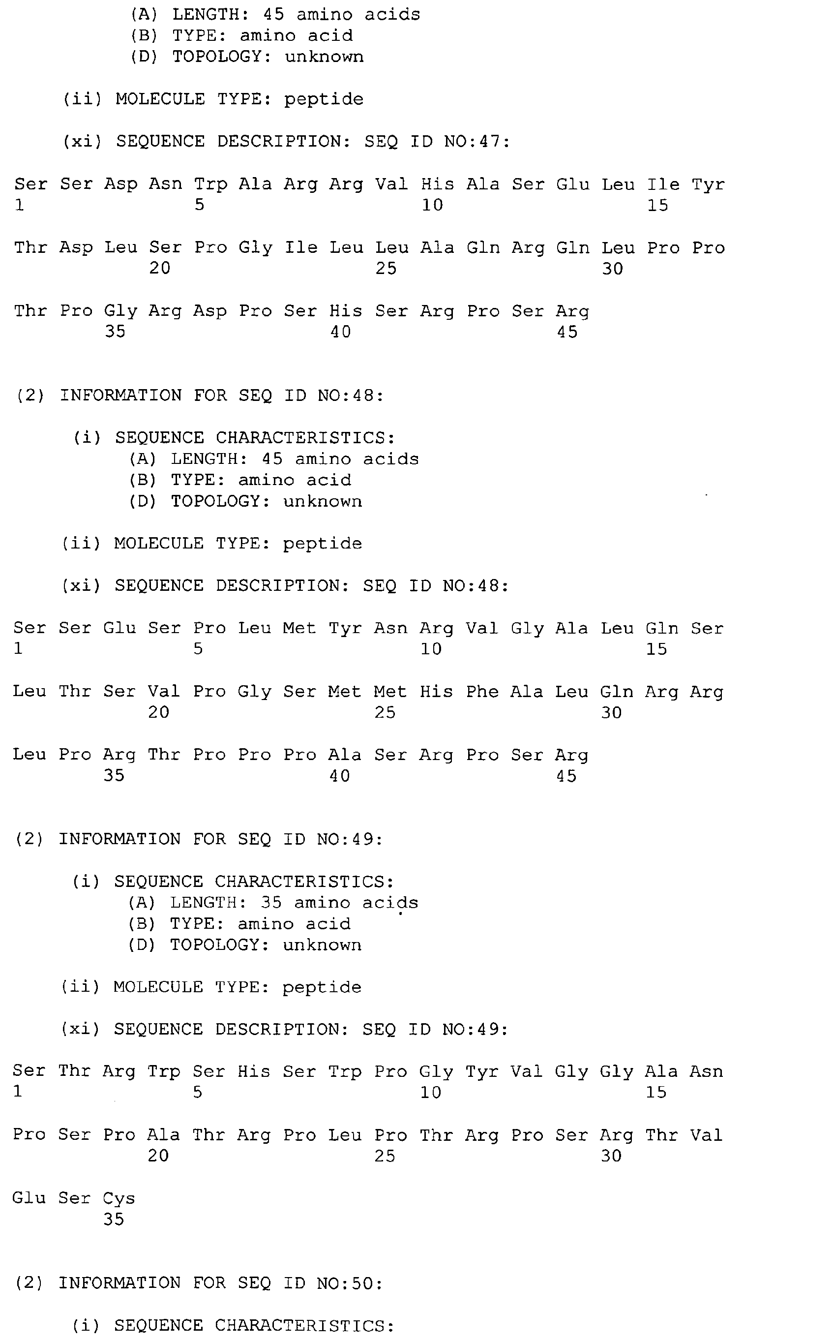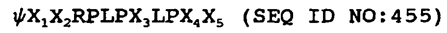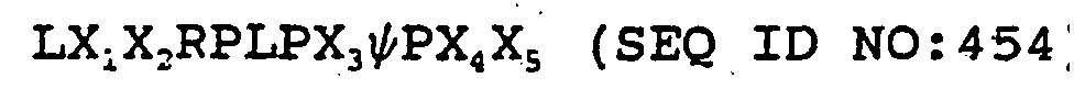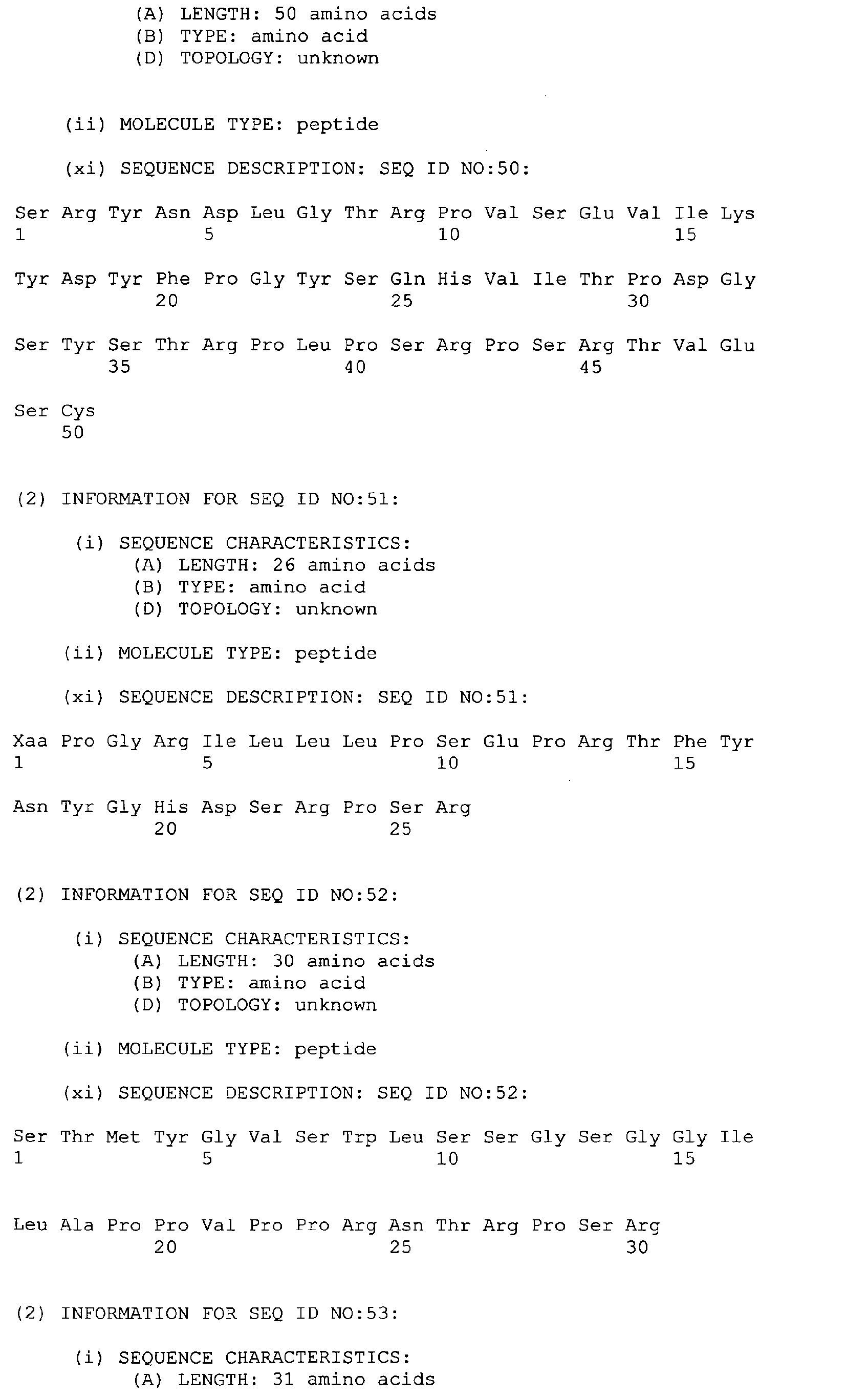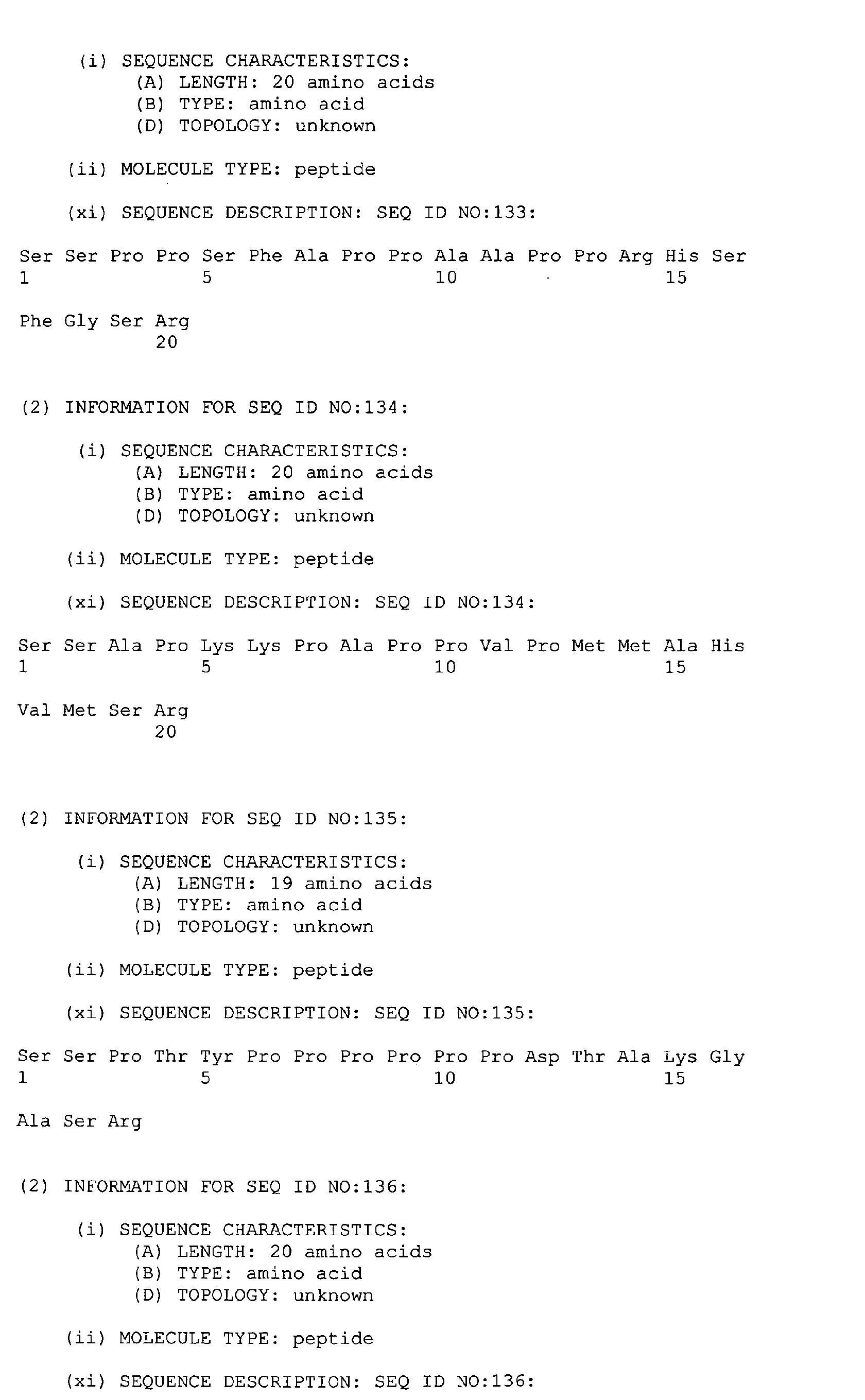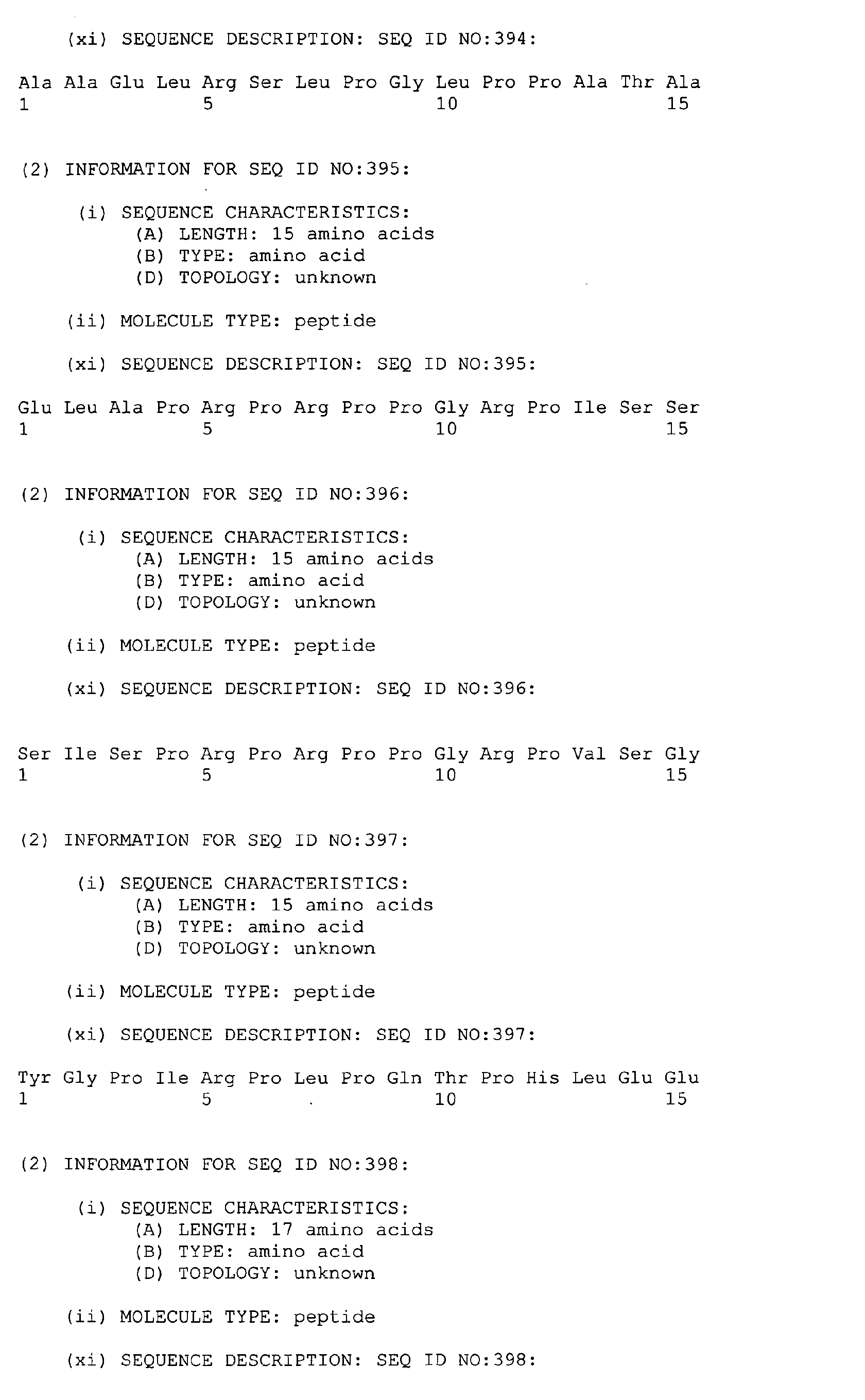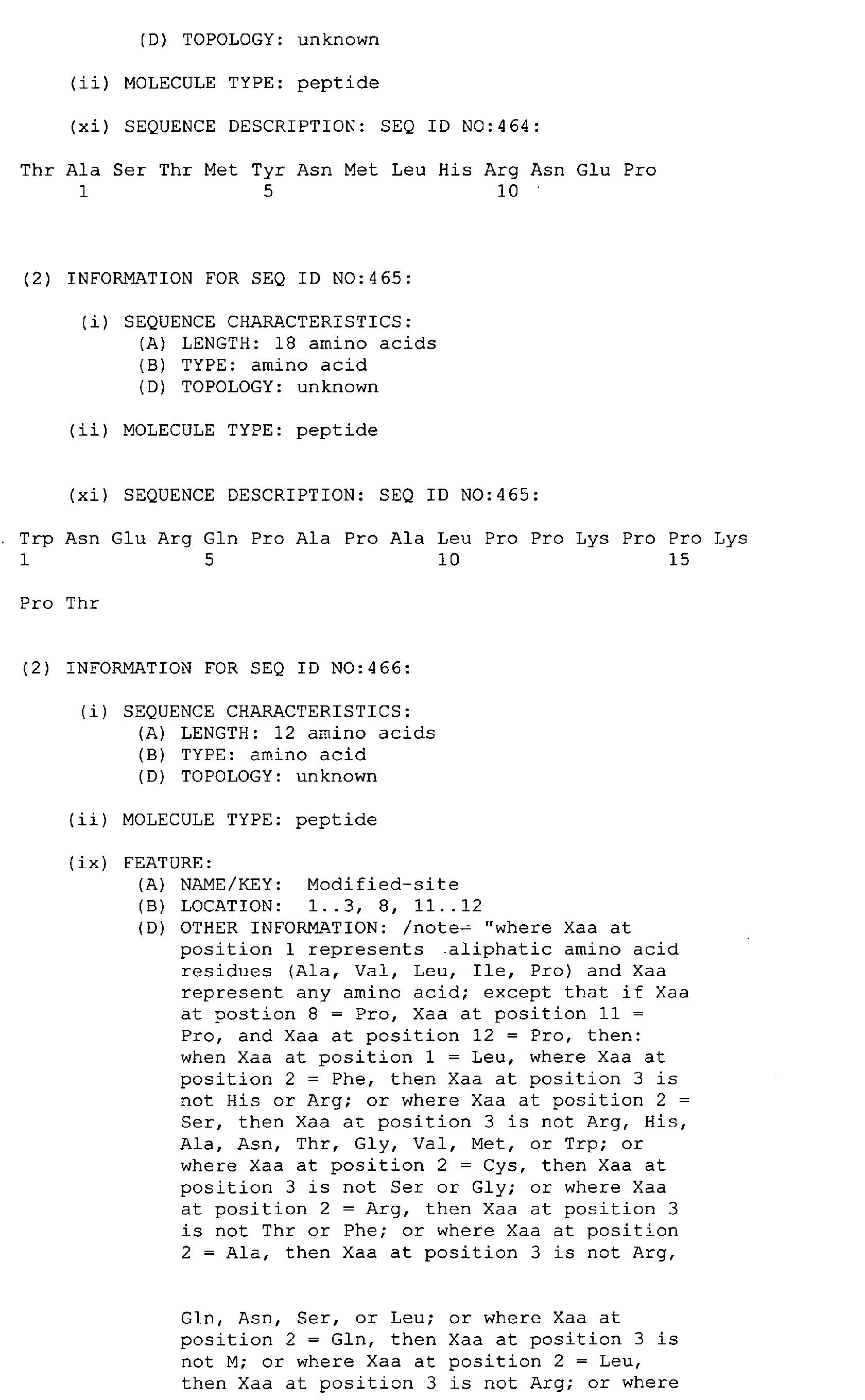 - Yu, et al. (Yu, H., et al., in Cell (1994) 76:933-945) used a "biased" synthetic peptide library of the form XXXPPXPXX (SEQ ID NO:2), wherein X represents any amino acid other than cysteine, to identify a series of peptides which bind the Src and PI-3' Kinase SH3 domains.